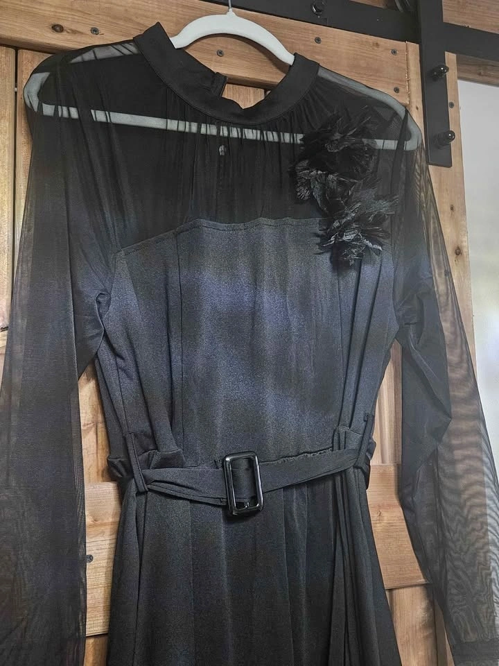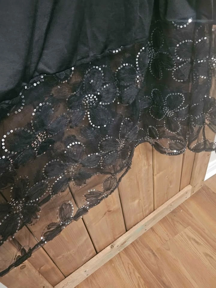 Very pretty dress new without tags. Pretty lace detail on bottom. Very comfortable, stretchy material. Purchased but never worn. Size 14. Comes from a smoke-free home. Located in Frankford.
