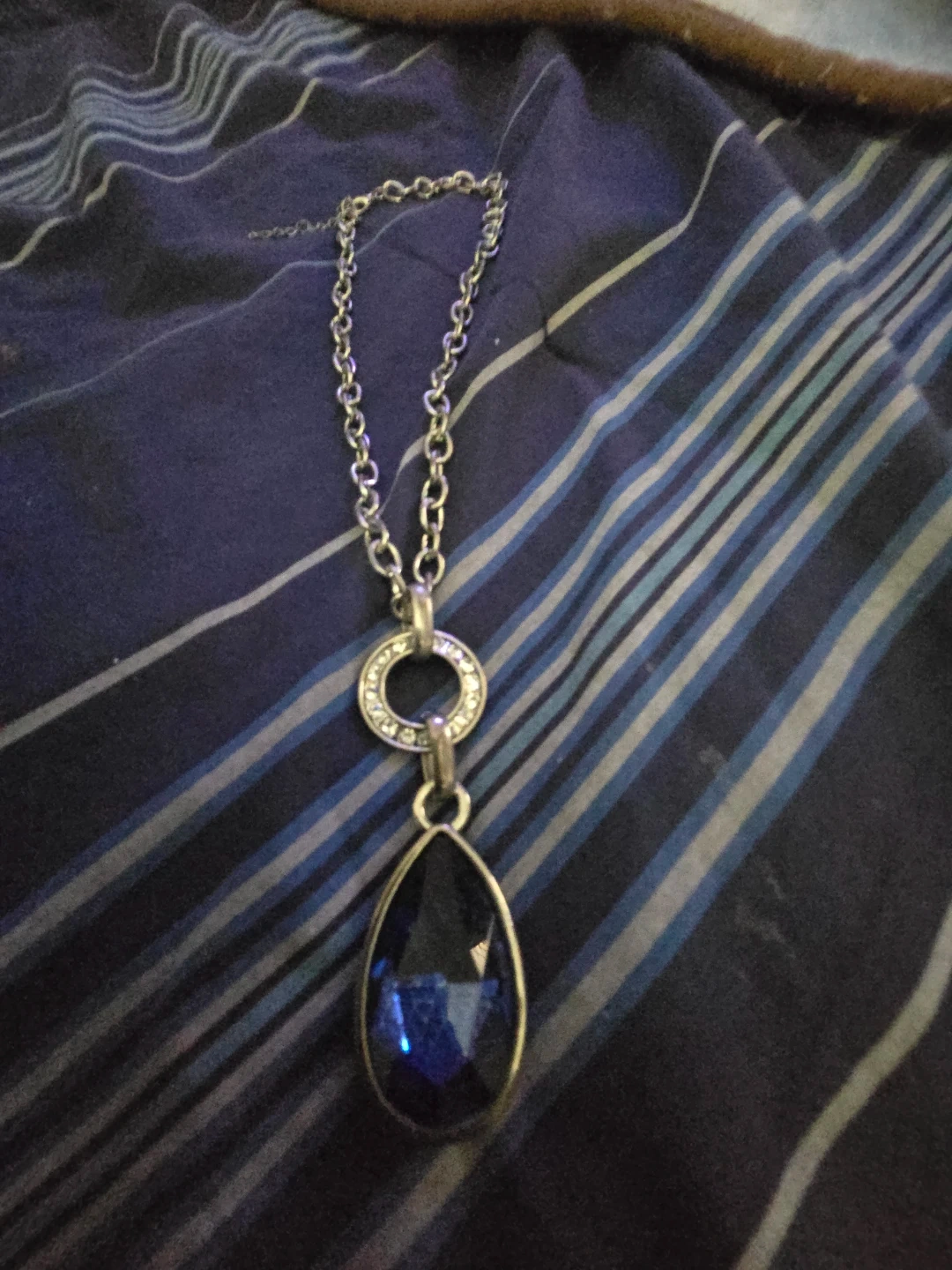 Selling a lovely necklace with a teardrop-shaped blue pendant. The pendant has a silver-tone setting and hangs from a delicate chain. The necklace also features a small, circular accent piece with clear stones above the pendant. It's in great condition and would make a beautiful addition to any outfit