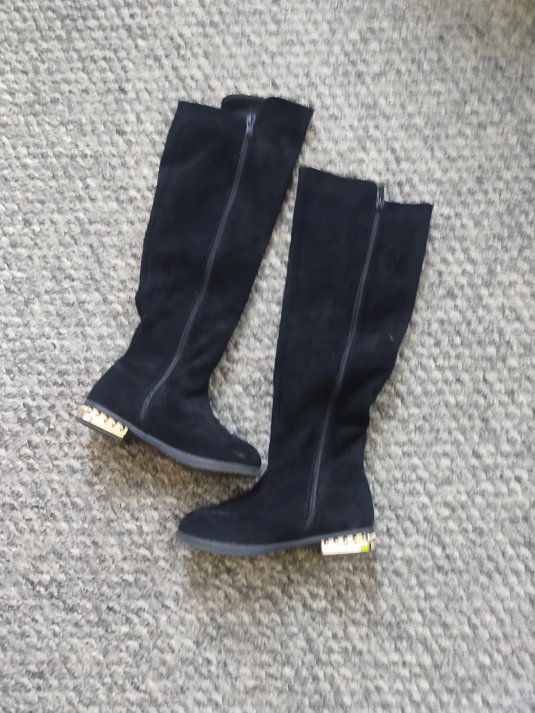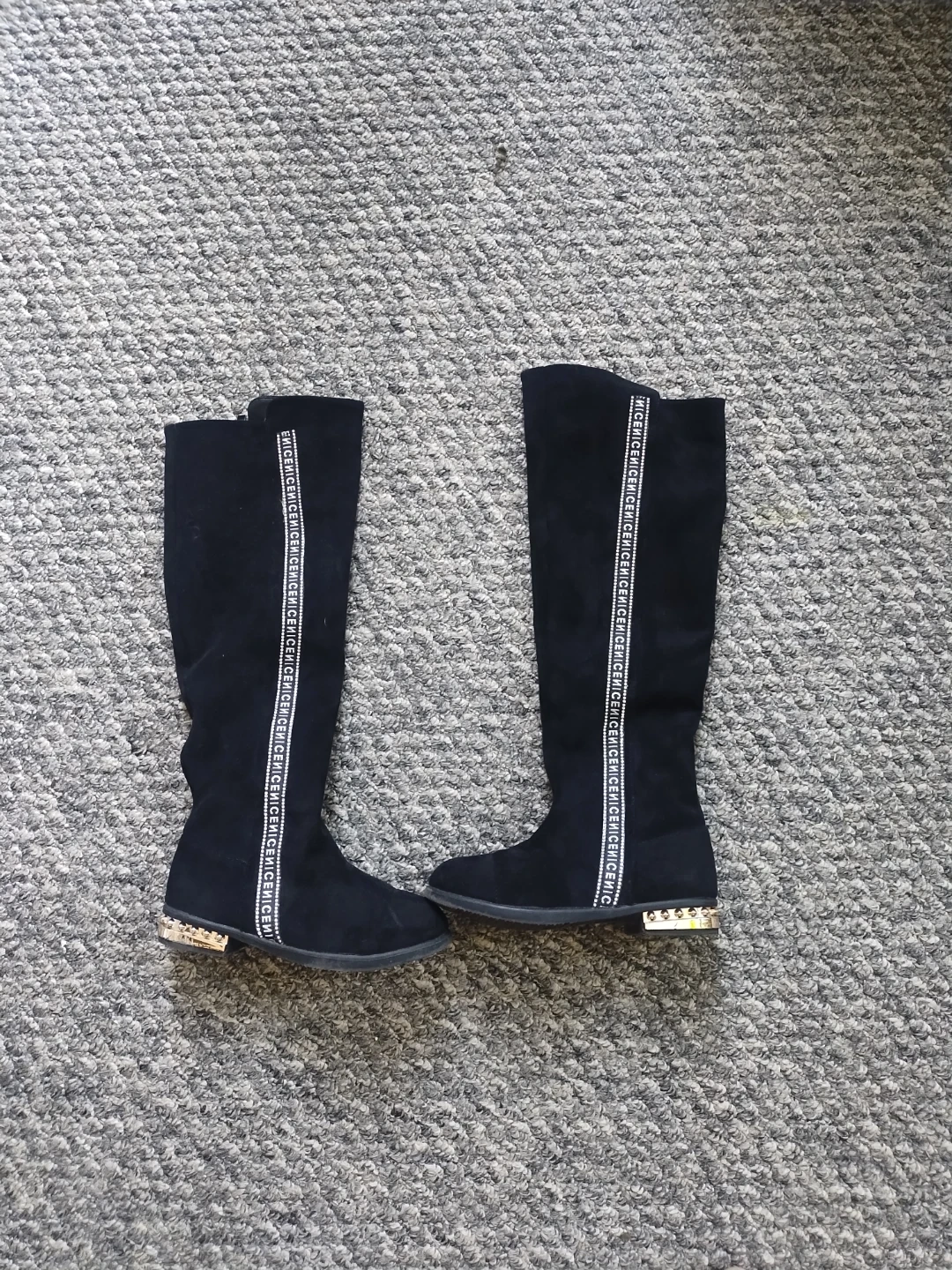 Selling a pair of black knee-high boots in great condition! They are a size 13 kids and feature a stylish design. Perfect for adding a touch of elegance to any outfit