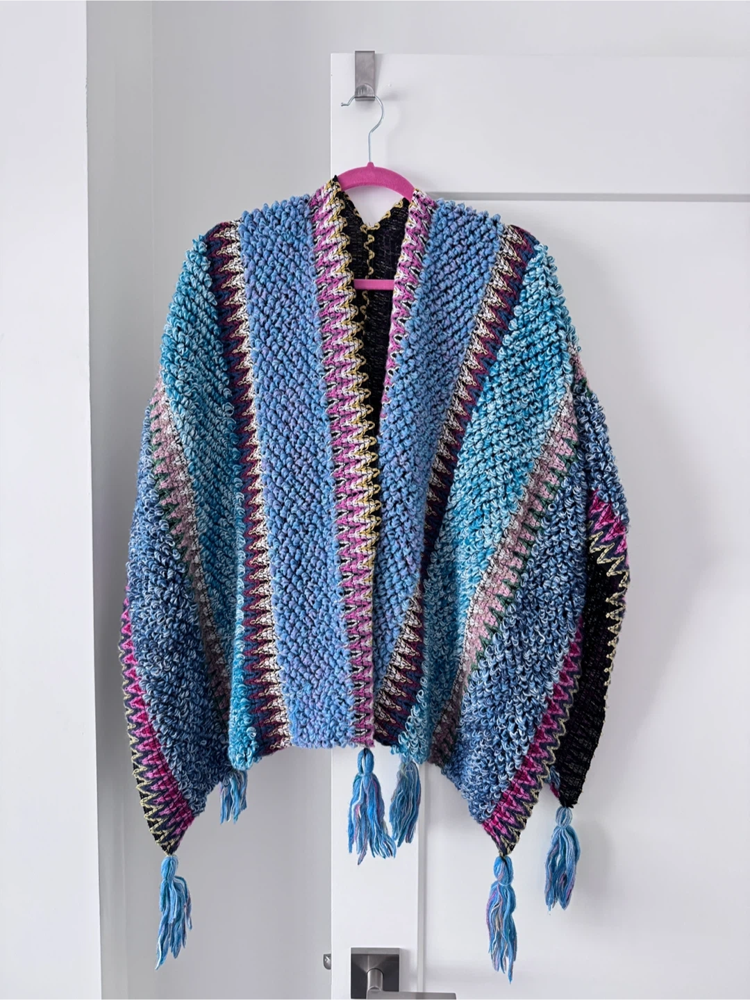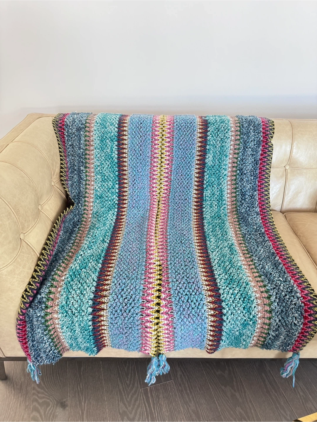 Beautiful crochet throw blanket or shawl. It features a unique design with vibrant colours and tassels. Perfect for adding a touch of warmth and style to your home or wardrobe!