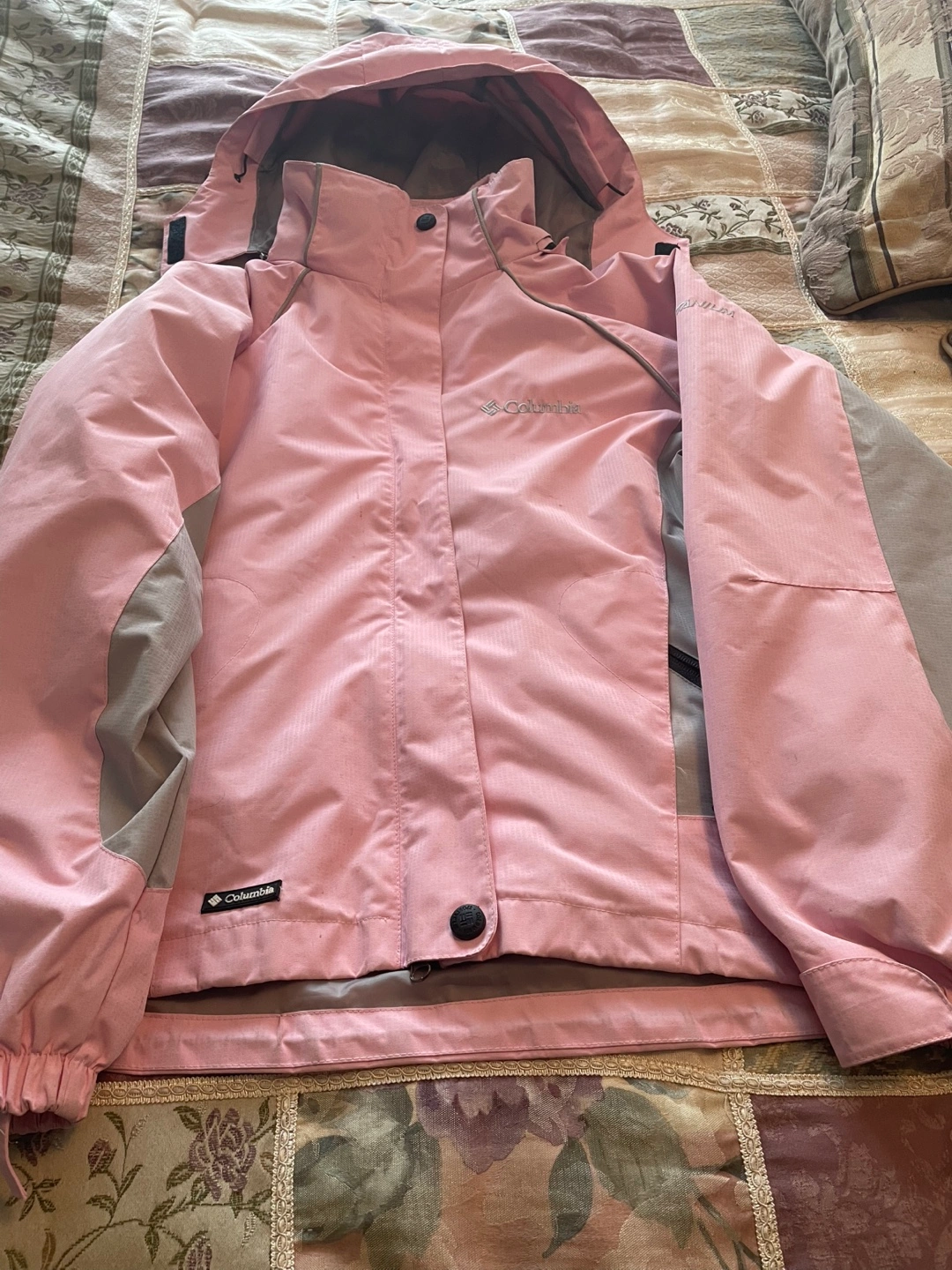 Selling a Columbia titanium women’s Interchange jacket in a lovely pink and gray colour combination! It's a size L and has many pockets pockets and in great condition. Perfect for layering and staying warm during cooler weather or fall and spring it’s a 4 in 1 also can unzip the and just wear it as a fleece in warmer weather conditions if i get the price i want or close to i will give you a free pair of mittens with fur in the inside purple only take cash please no e-transfers thank you