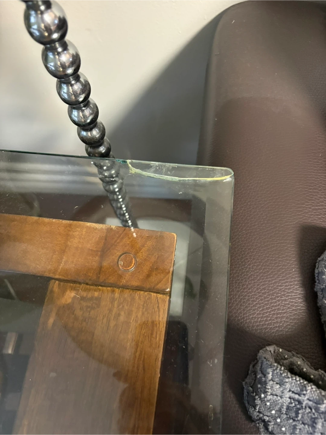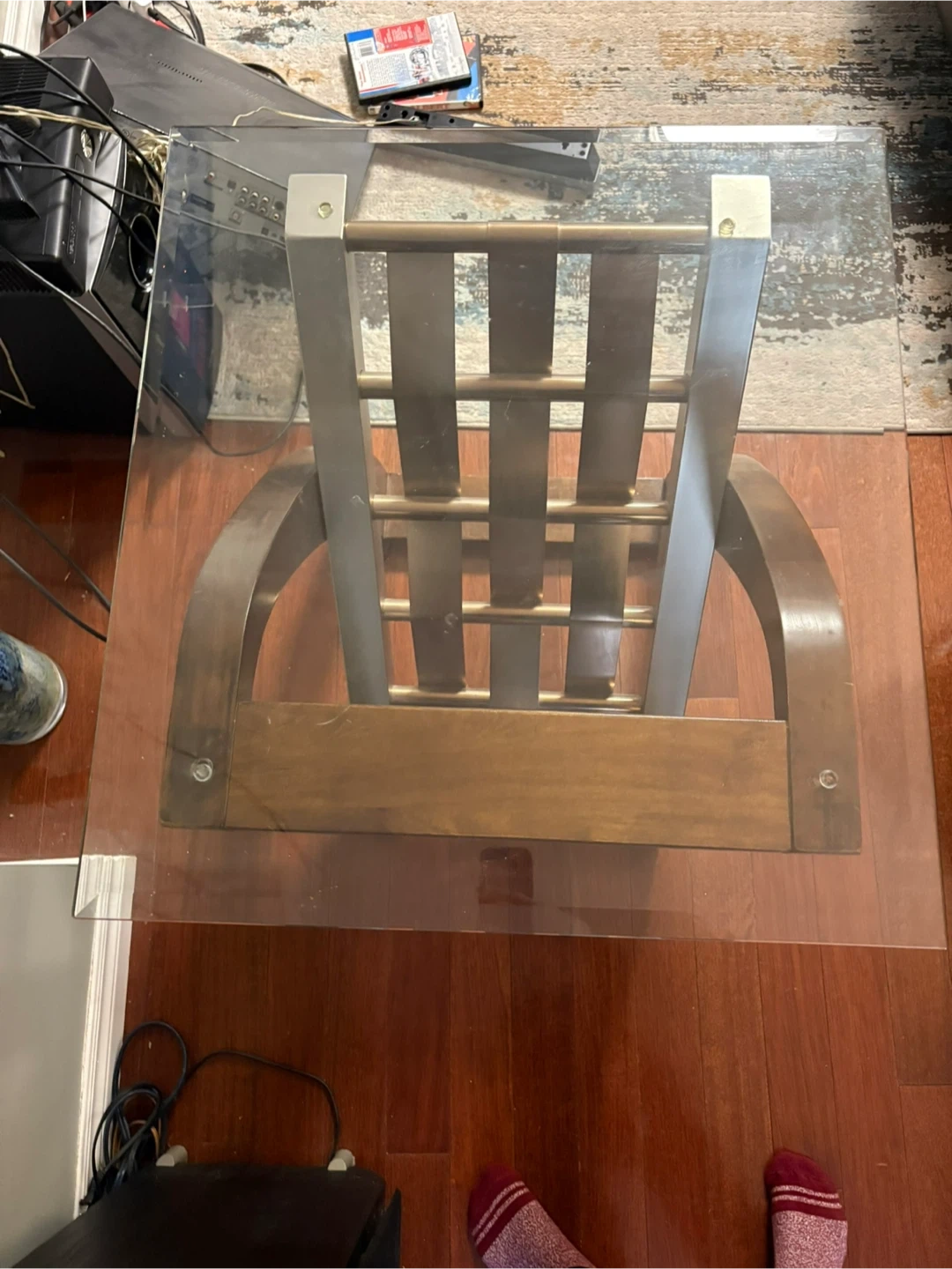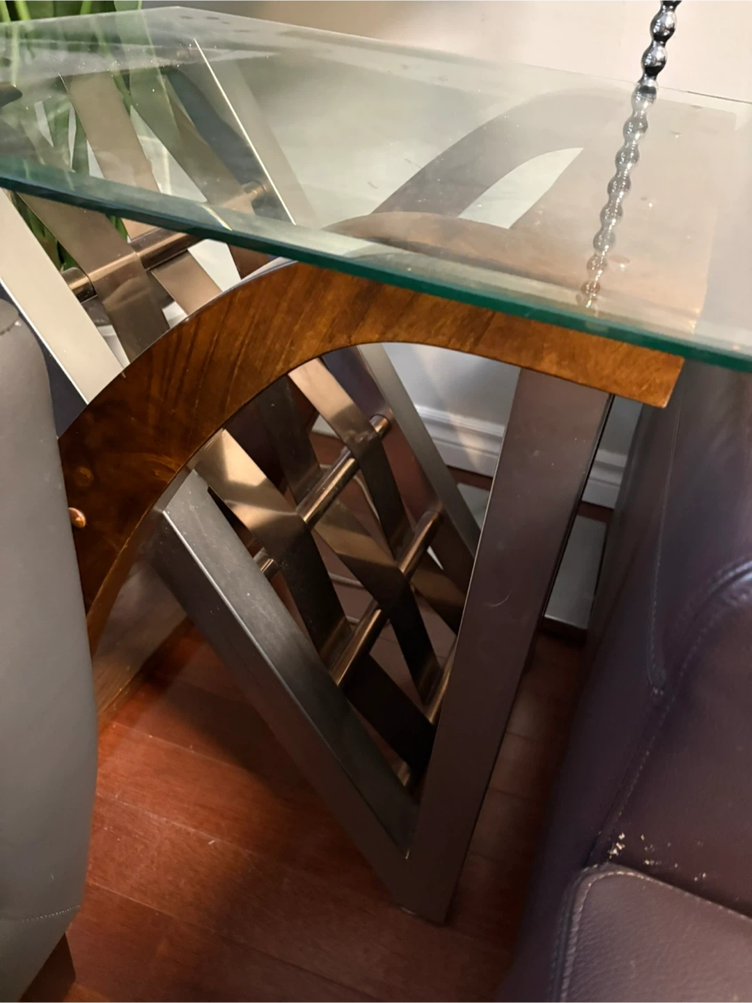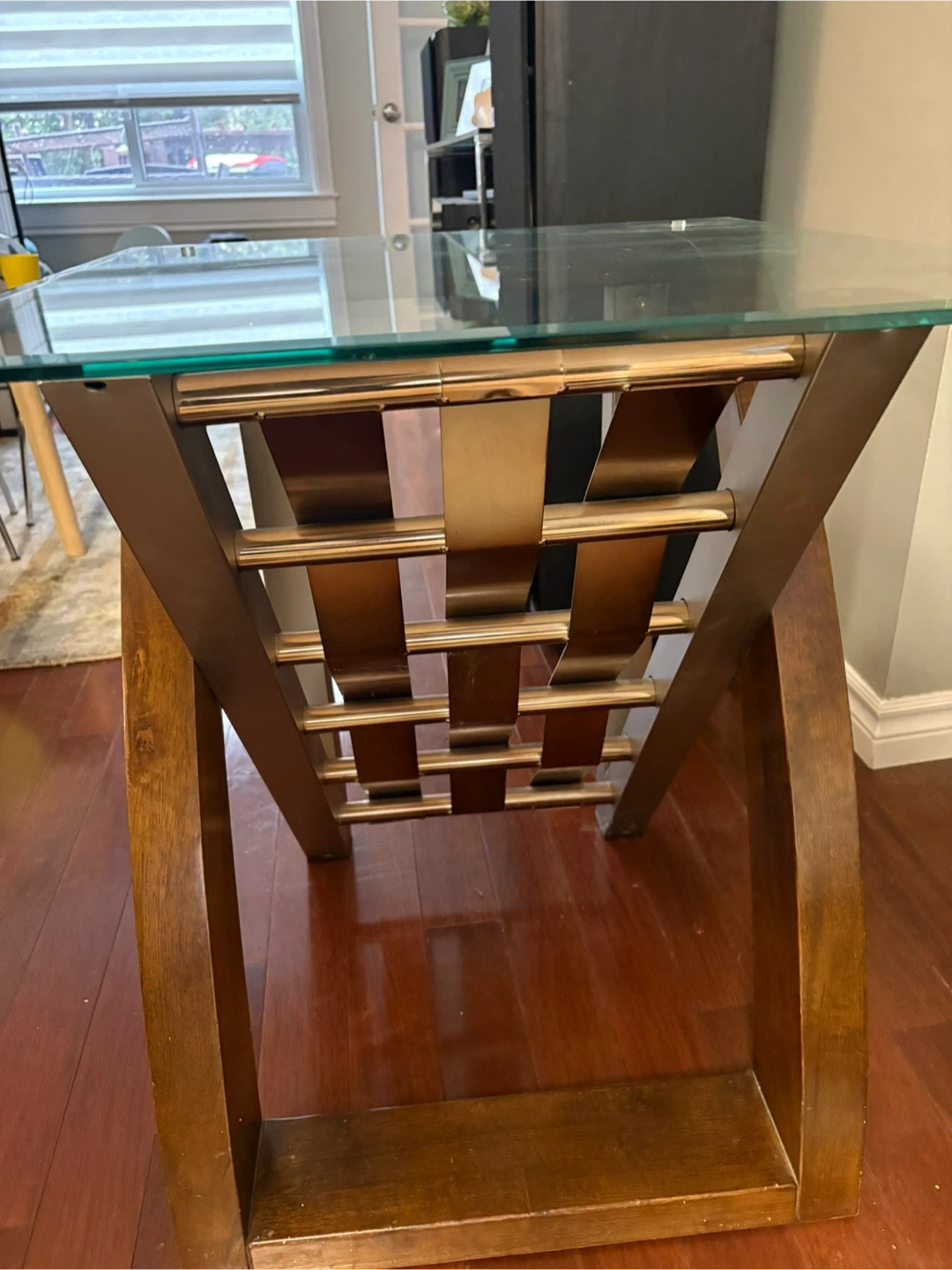 Selling 2 glass top and a unique wooden and metal base side tables. It has some wear and tear on the glass top, as shown in the photos. Still a stylish piece for any living room!