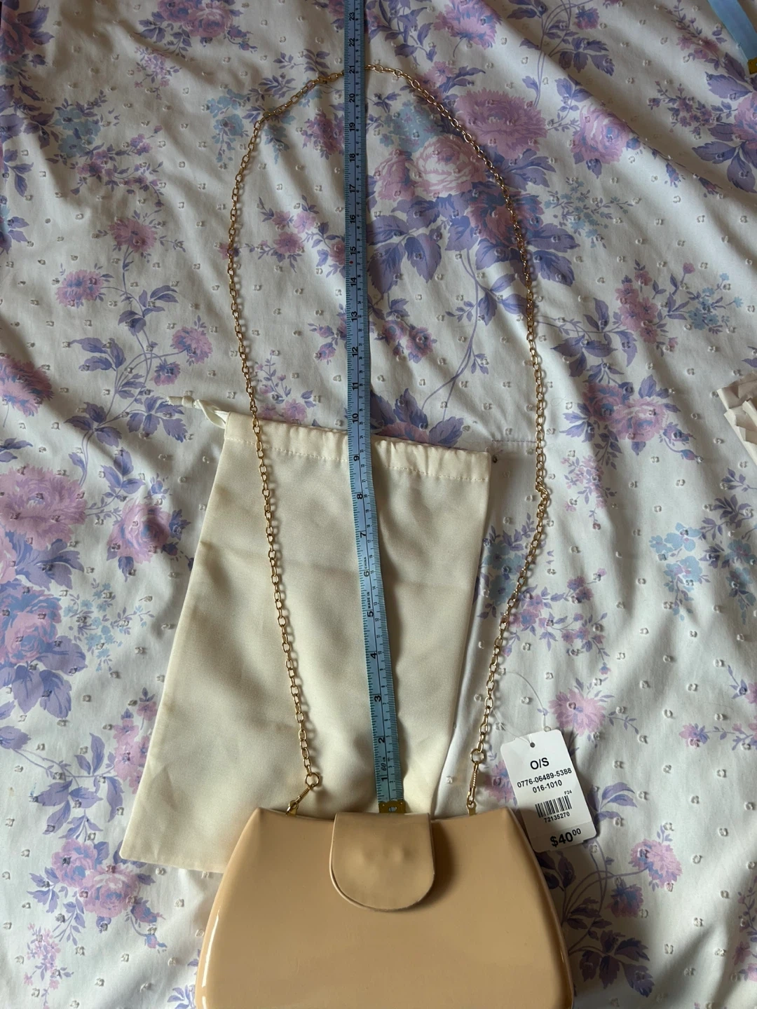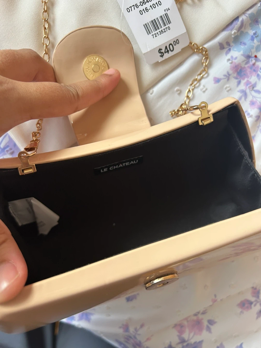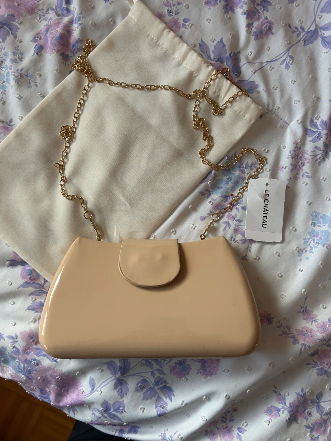 This is a Le Chateau clutch purse in a lovely beige colour. It comes with a gold chain and a magnet button closure. Was purchased for $40.