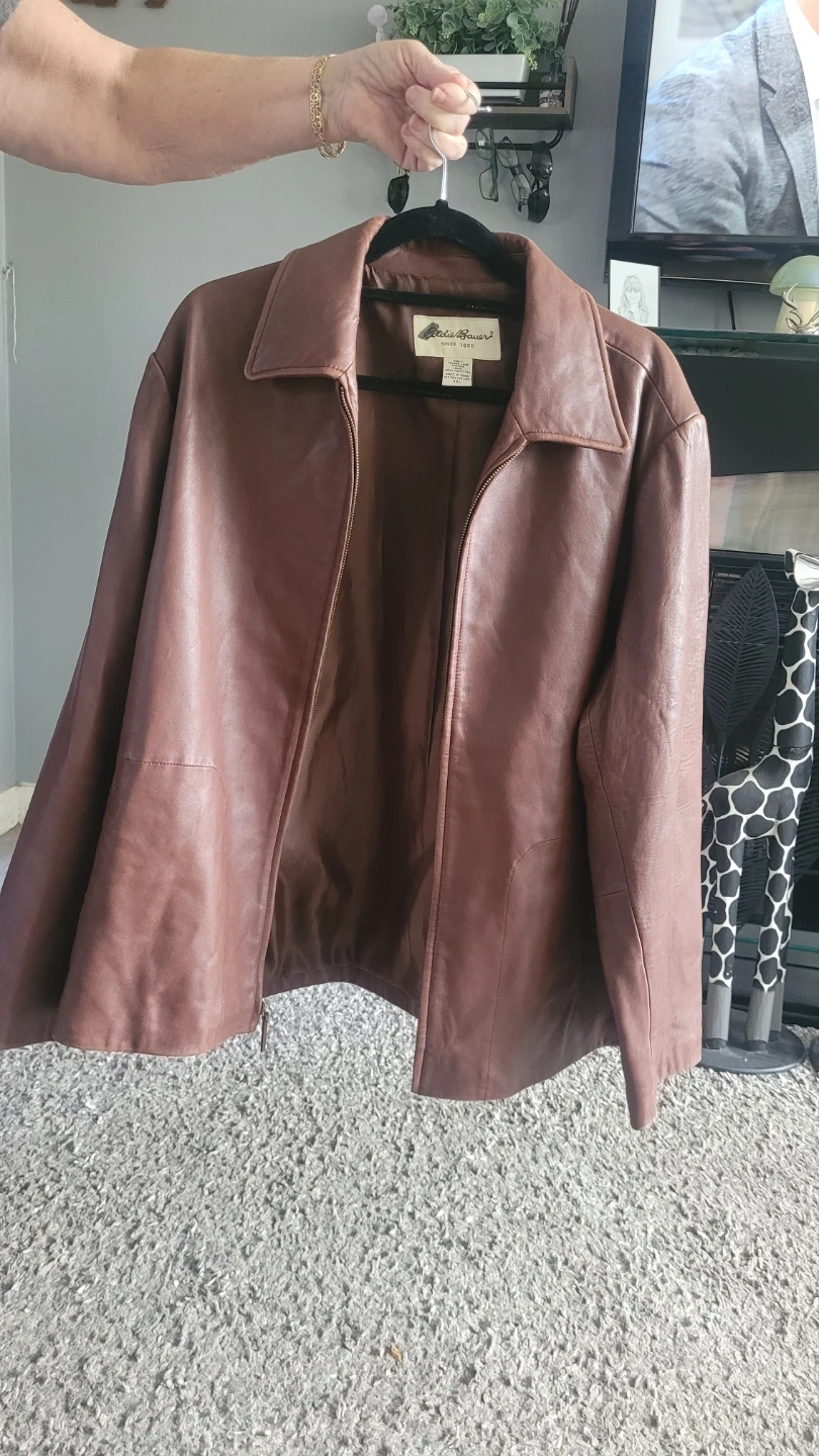Eddie Bauer genuine lamb leather jacket in size XXL. The lining is 100% polyester. It's a beautiful brown colour and in good condition!
