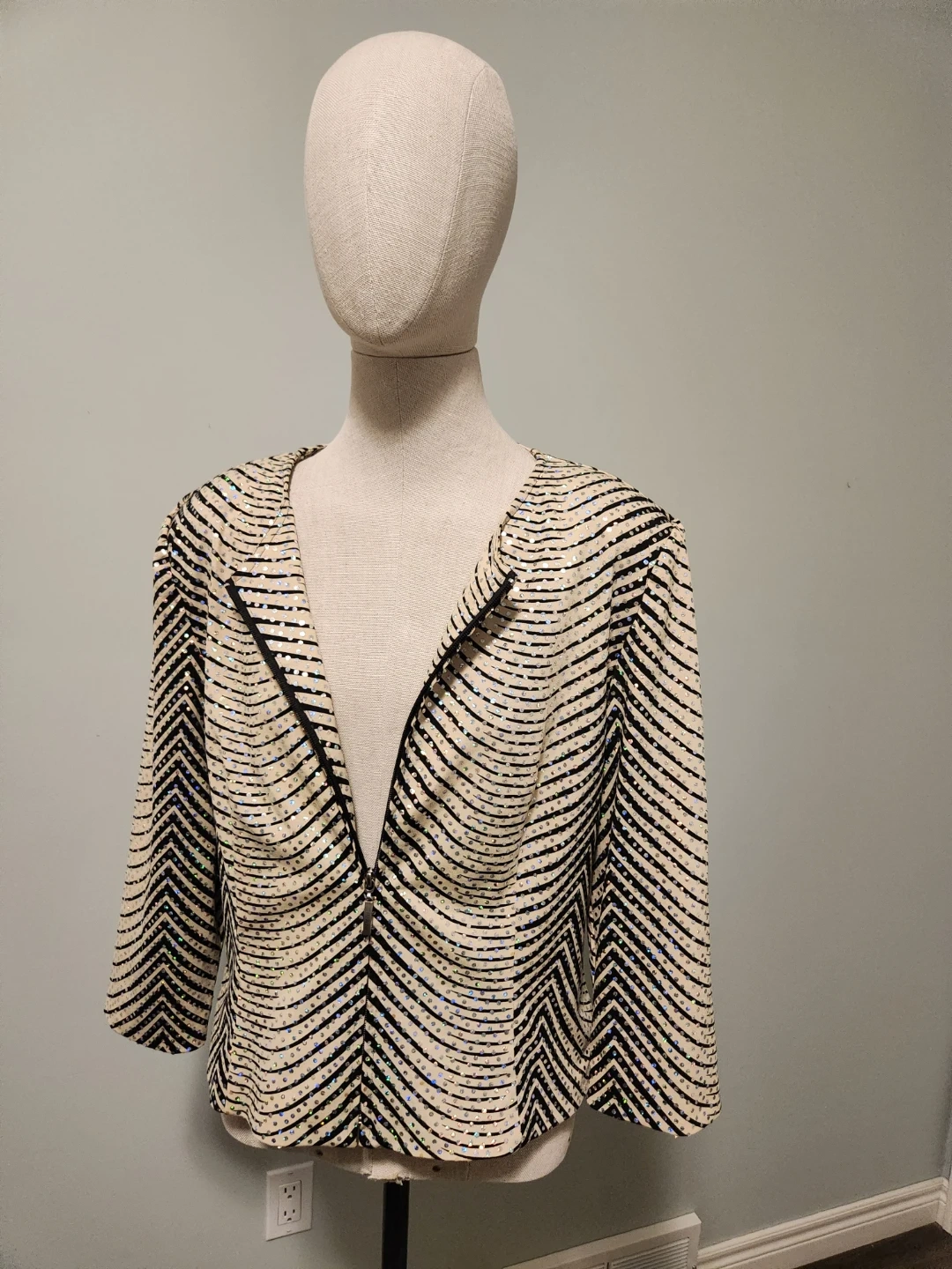 Selling a Gilani blazer in size 14. It features a zebra-like pattern with some embellishments. Perfect for adding a touch of sparkle to your outfit!