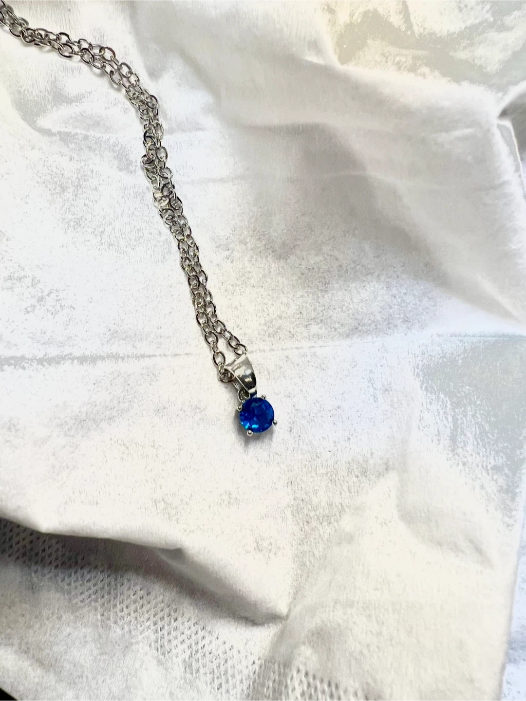 Selling a lovely sterling silver plated necklace featuring a delicate blue, simulant Sapphire, gemstone pendant. The necklace is approximately 18 inches long. It comes in a beautiful pink box with a ribbon, making it perfect for gifting or safekeeping! Firm on price.