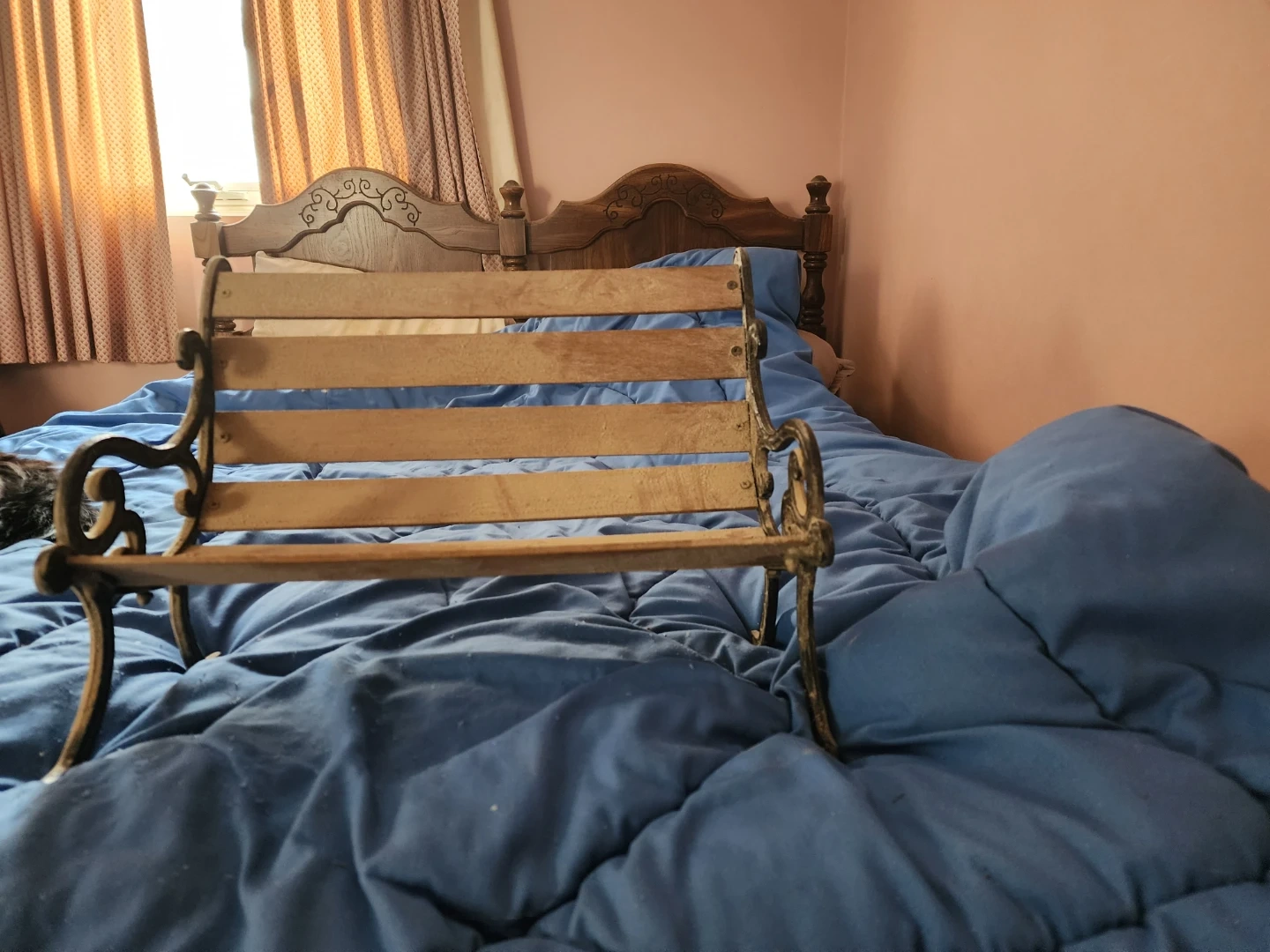 Selling a cute miniature bench with a wooden seat and metal frame. It's in good condition and would look great as a decorative piece!