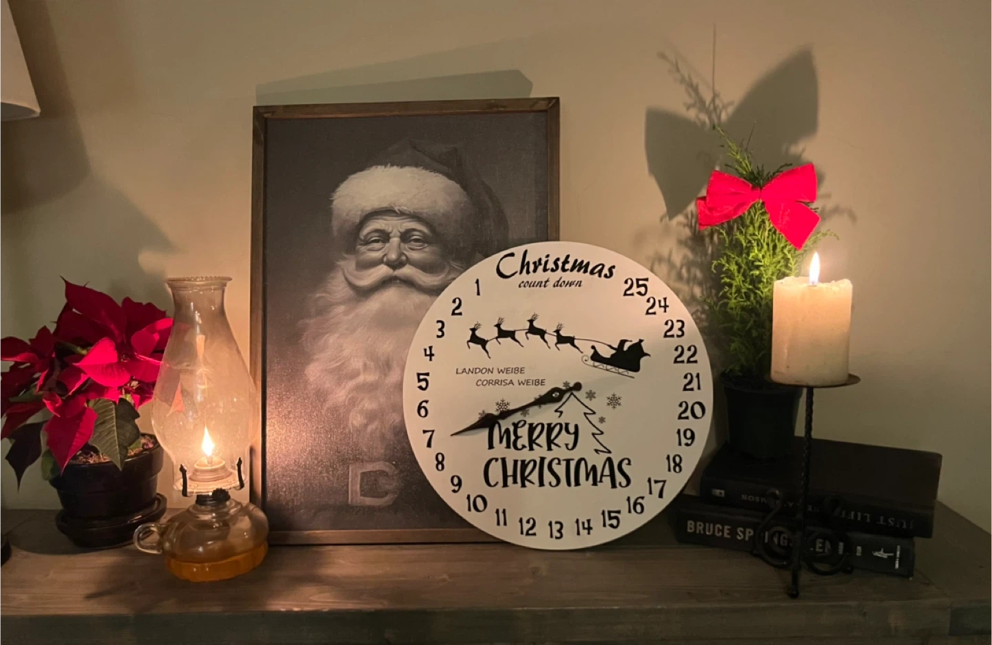 Selling a Christmas countdown clock! It features a festive design with reindeer and a Christmas tree. A great way to get into the holiday spirit. I can personalize it with names or a date. I have one available, but can’t make more if necessary add any sort of decoration on the clock.