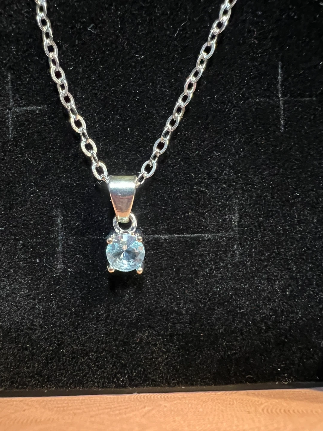 Selling a lovely sterling silver plated necklace featuring a delicate light blue, simulant Aquamarine, gemstone pendant. The necklace is approximately 18 inches long. It comes in a beautiful pink box with a ribbon, making it perfect for gifting or safekeeping! Firm on price.
