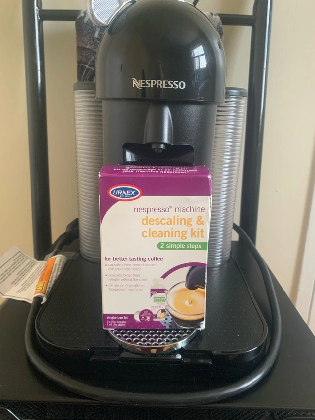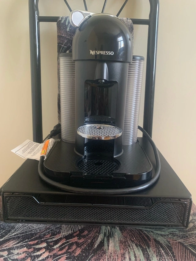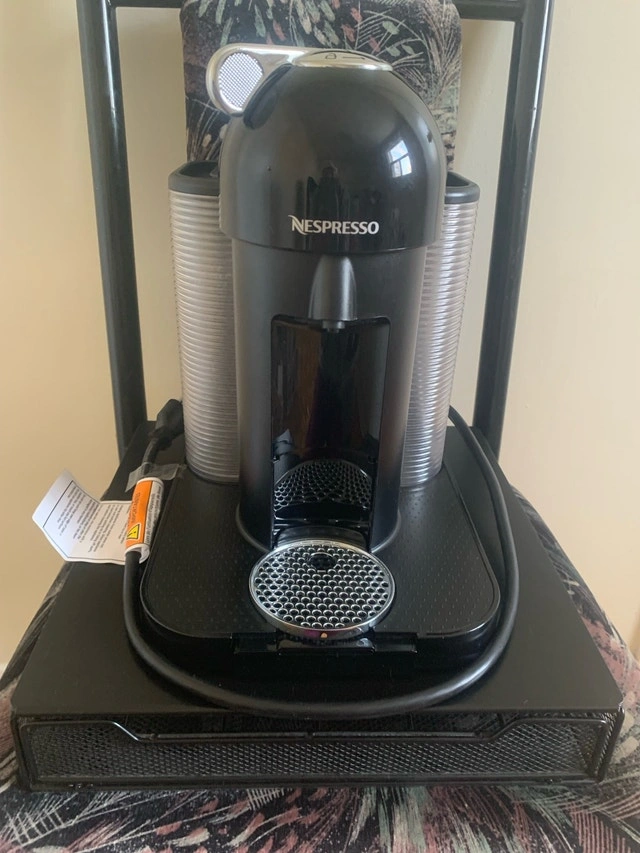 Brew your favourite espresso with this Original Nespresso Coffee Machine! This machine is previously owned but in good working condition and has been well-maintained, and even comes with a Nespresso descaling kit so you can continue to enjoy great coffee. * Capsule System: Nespresso OriginalLine * Colour: Black * Removable Water Tank: Yes Coffee capsule holder stand box if free. Capsule compatibility is wide variety of Nespresso and third party capsules. I used Starbucks. Coffee capsule holder stand box is free (original value $40).