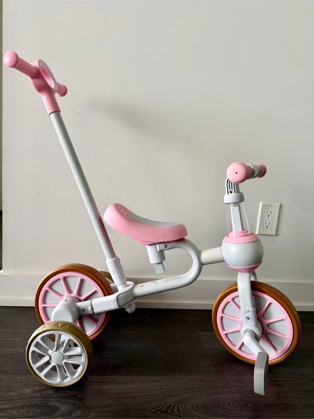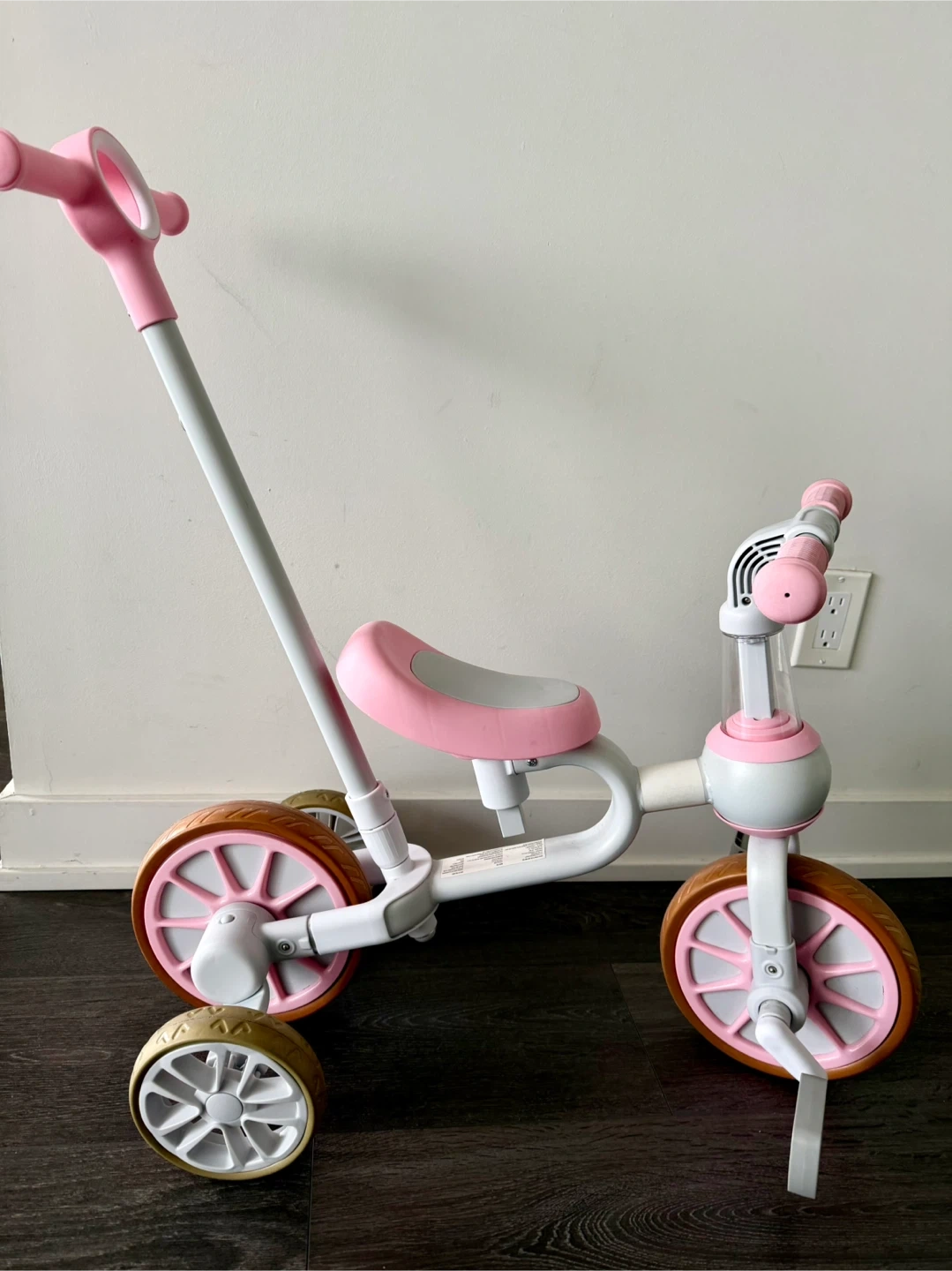 Selling a cute tricycle in pink and white! It features a push handle, making it easy for parents to guide little ones. Perfect for toddlers learning to ride. Height adjustable .