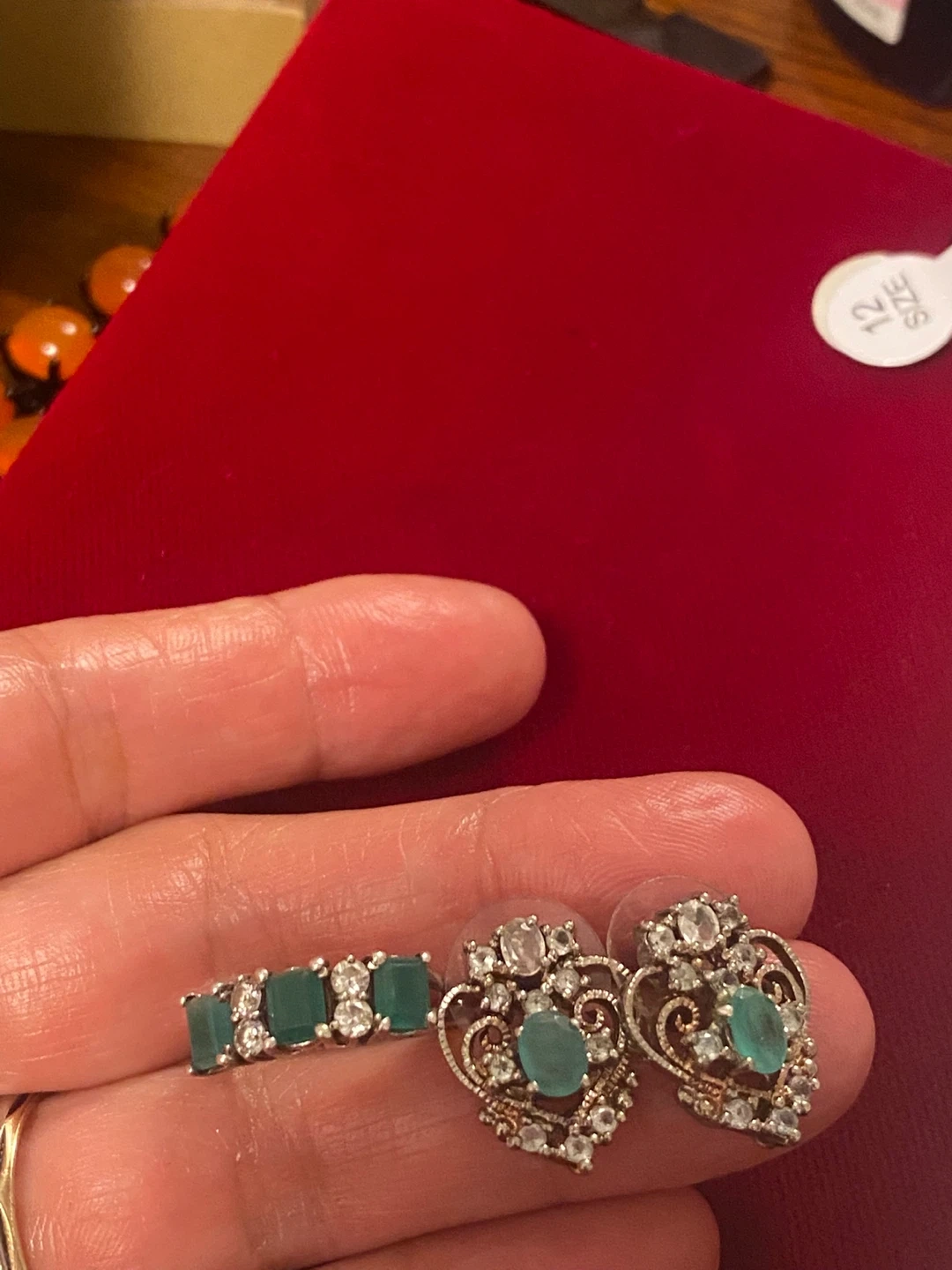 Selling a lovely set of emerald and diamond earrings and a matching ring. The ring is a size 7. They're in great condition and would make a beautiful addition to any jewelry collection