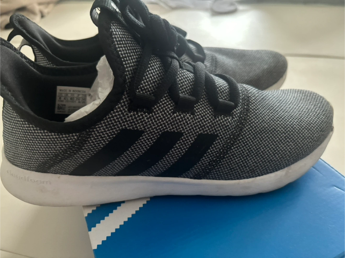 Selling a pair of Adidas Cloudfoam running shoes for women in size 8(250mm). These shoes are in good condition and come with the original box. They feature the classic Adidas stripes and cloudfoam cushioning for extra comfort!