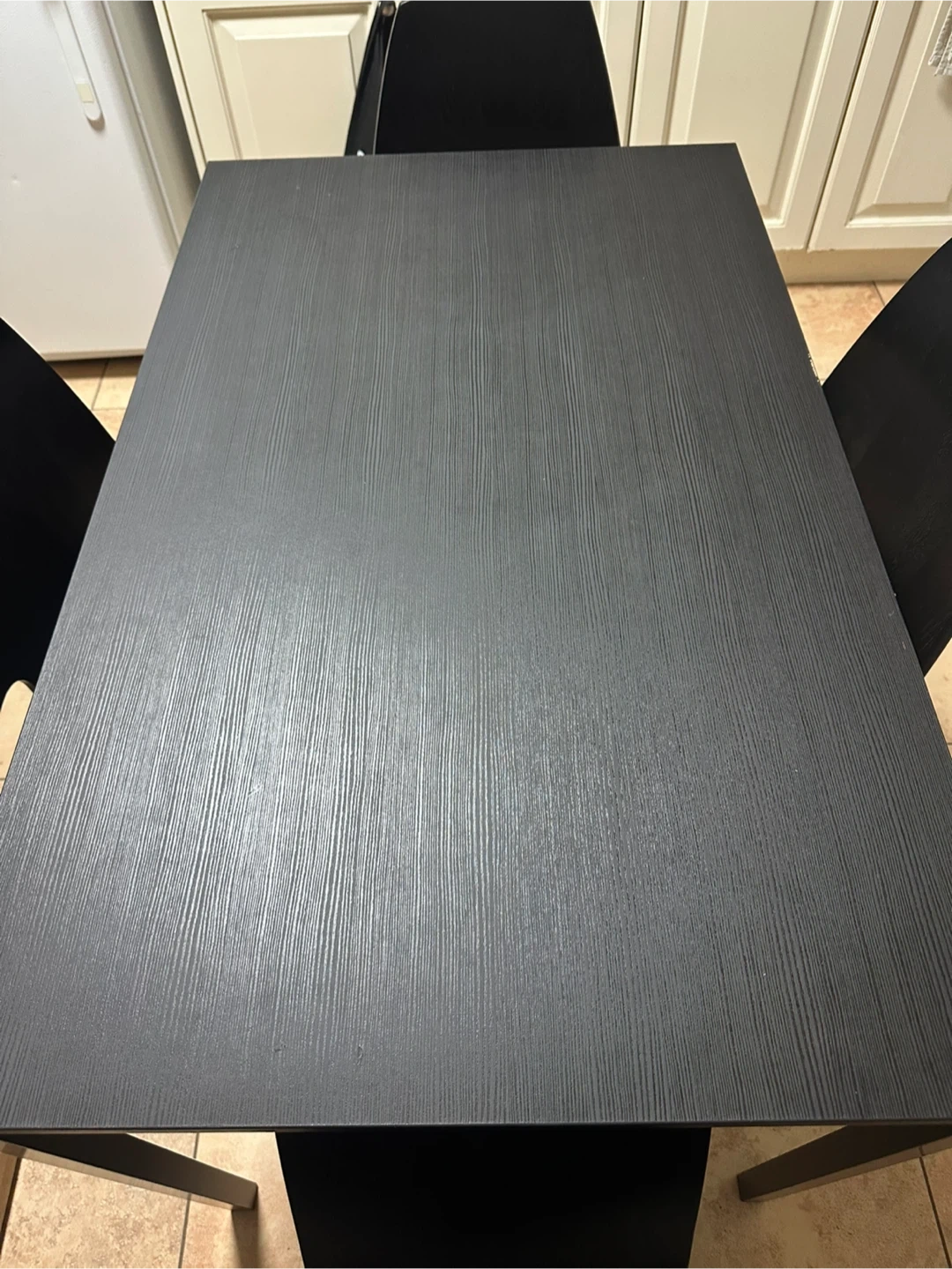 Selling a used IKEA dining table with chairs. The set is black and includes a rectangular table and matching chairs. The table measures approximately 49 1/4" x 29 7/8". Great for a small dining area!