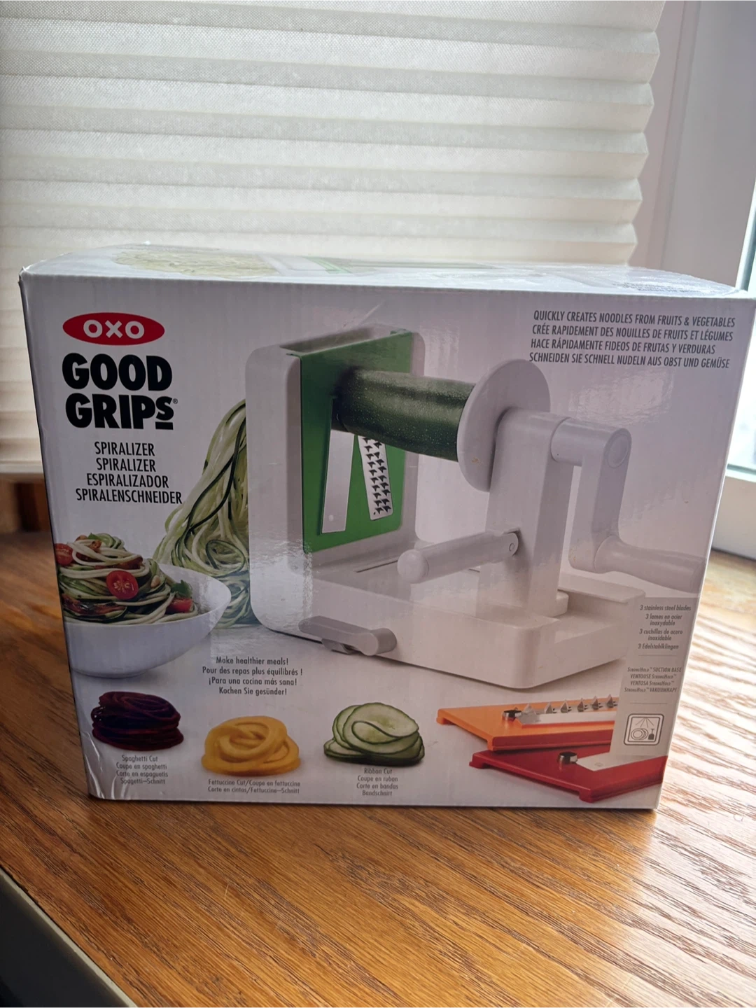 I'm selling an OXO Good Grips Spiralizer. It quickly creates noodles from fruits and vegetables. It comes with 3 stainless steel blades. Has suction cups to secure to counter. It's in great condition and comes with the box. 2 blades are brand new, only been used once or twice. Small crack on storage case for blades (see picture), doesn’t impact use. Sells for $60+ normally. Pick up Haysboro SW.