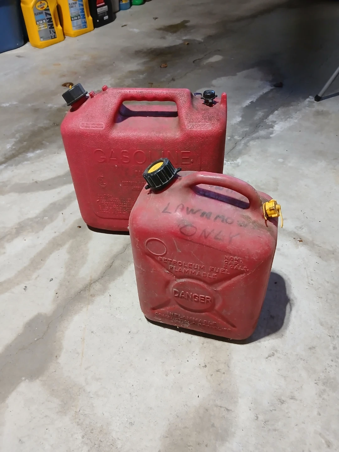 Selling two Wedco gas cans. One is a larger size, approximately 5 gallons, and the other is smaller. Both are red and have some wear, with one labeled "Lawn Mower Only".