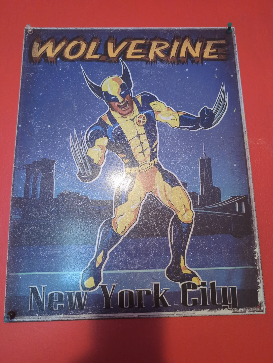 Selling a Wolverine metal sign featuring a New York City backdrop! It's a cool piece for any Marvel fan's collection or to add some character to your space