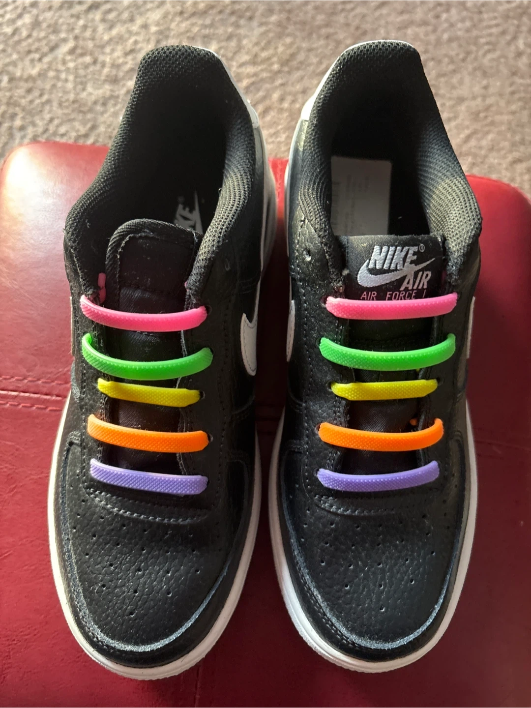 Selling a pair of Nike Air Force 1 kids' sneakers in black. They have some fun, colourful laces. Great condition and ready for a new owner! Size 6 youth.