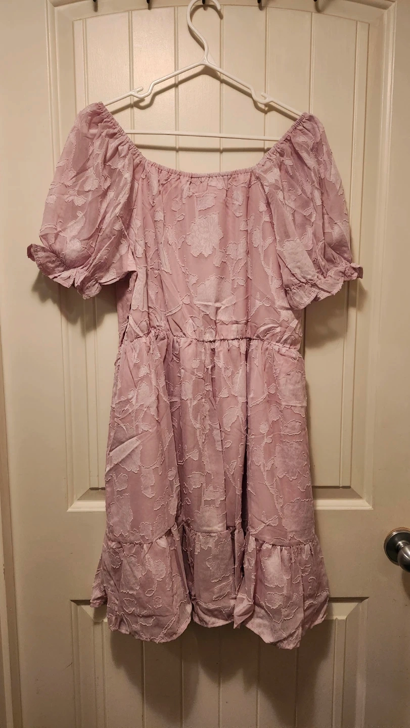 Selling a brand new Sampeel dress! It's a beautiful pink colour with a floral pattern. The dress is size XL and has a cute off-the-shoulder style with short, puffy sleeves. Perfect for a sunny day out!