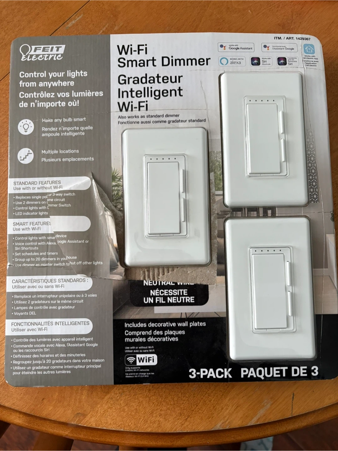 Selling a brand new Feit Electric Wi-Fi Smart Dimmer 3-pack! Control your lights from anywhere with this smart dimmer. It works with Google Assistant, Alexa, and Siri Shortcuts. Includes decorative wall plates. Item is brand new, packaging has wear as shown in pictures.