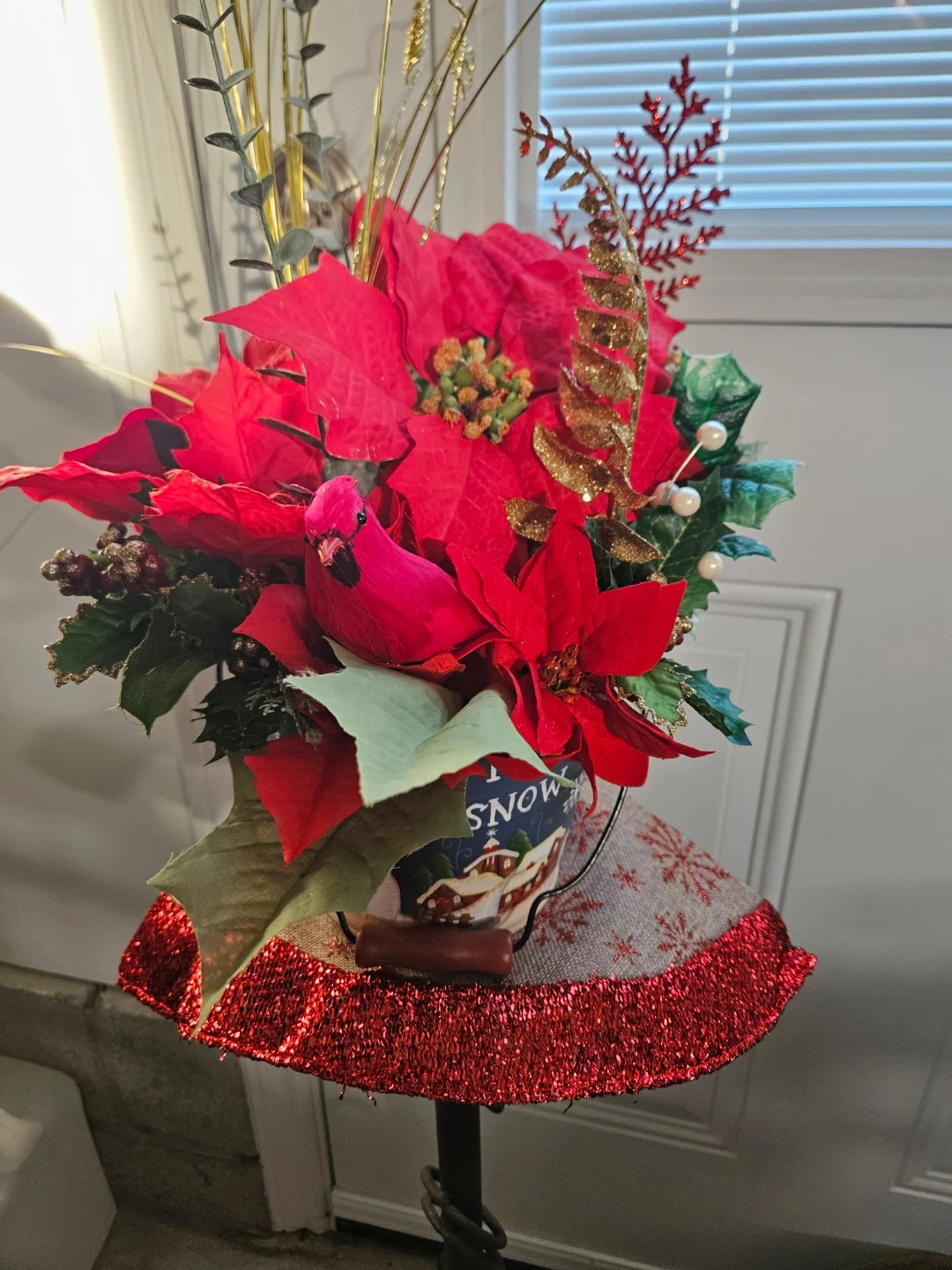 A lovely Christmas floral arrangement featuring red poinsettias and a cute cardinal. The arrangement is in a bucket that says "Let It Snow" with a snowman design. Perfect for adding a festive touch to your home! 1 of a kind