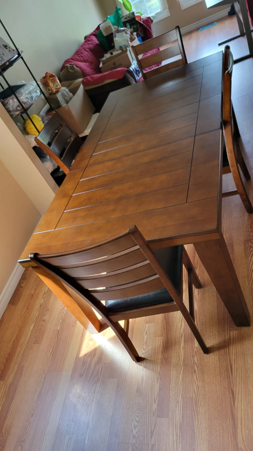 Selling a dining table with four chairs. It's a wooden set in good condition. Perfect for a family or small gatherings!