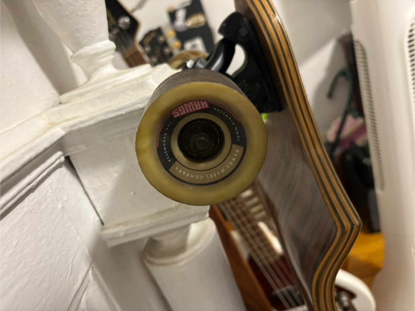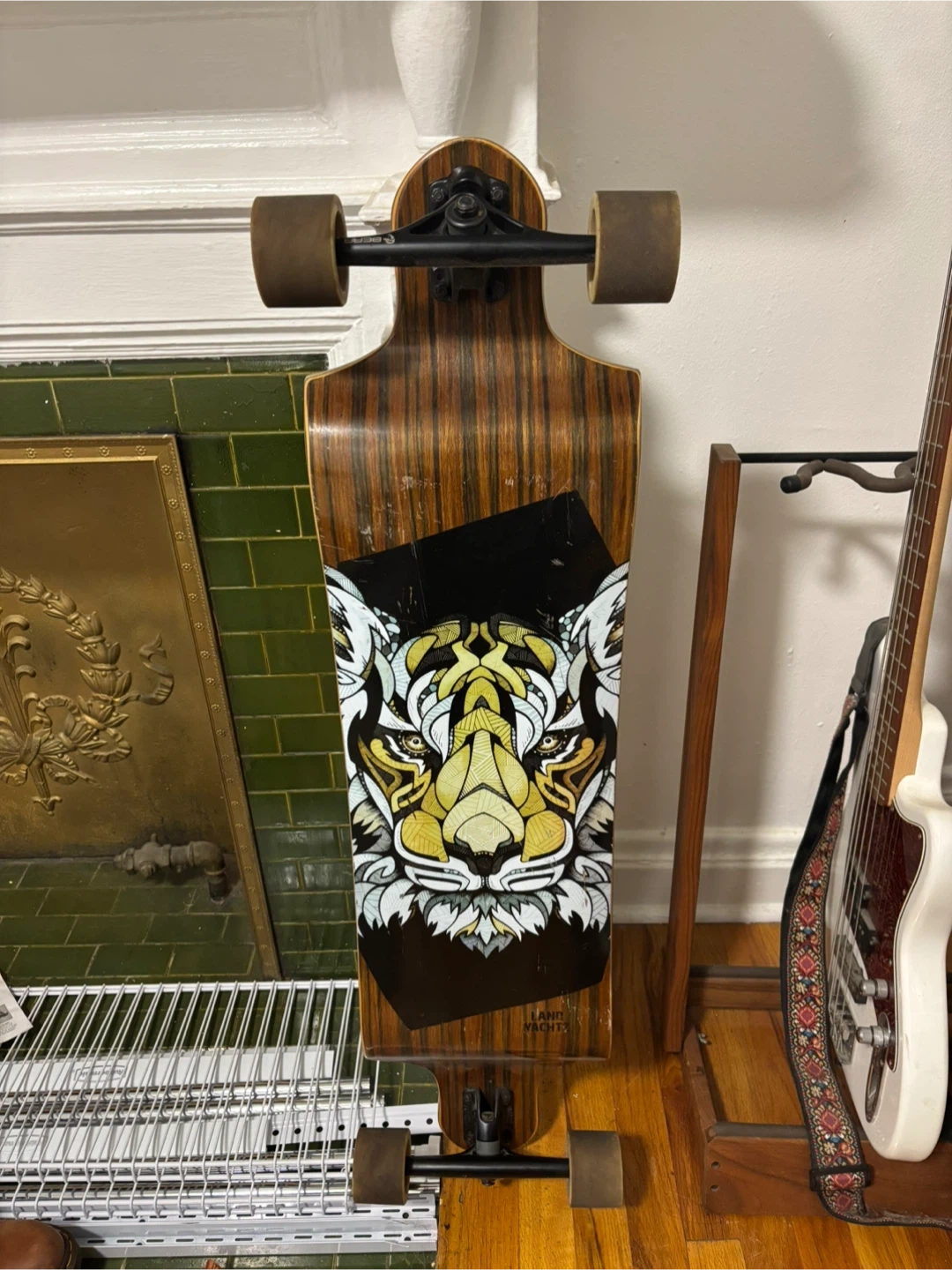 Selling a Land Yachtz longboard skateboard. It has a cool tiger design on the bottom. The wheels are Hawgs Wheels Company, 70mm diameter. Great for cruising around town!