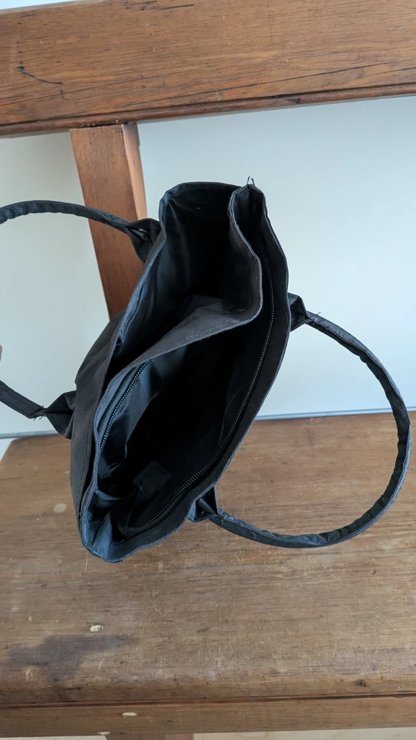 A handy black tote bag, perfect for carrying your essentials. Waterproof, 1 zipper section and 1 open.
