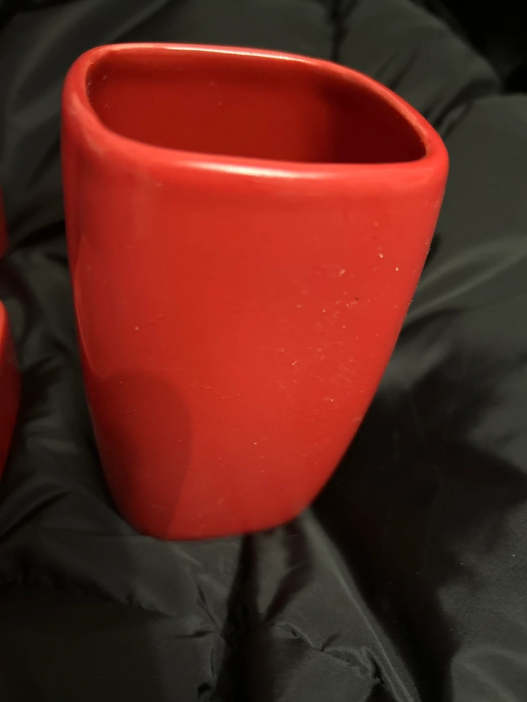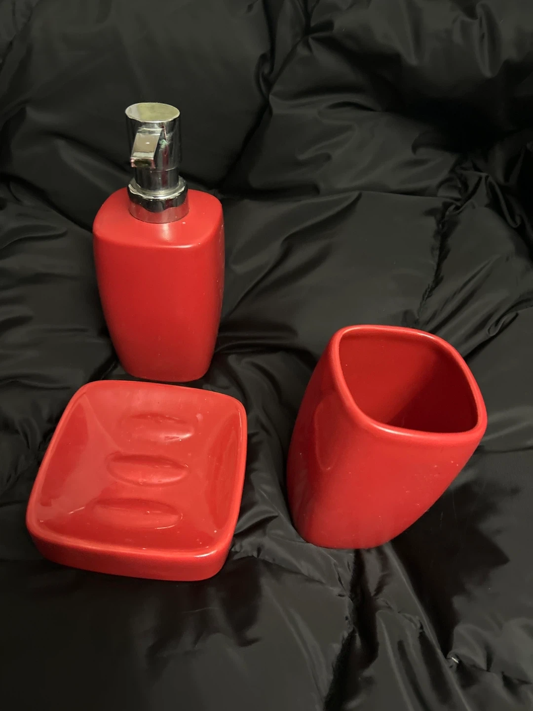Here's a cute red bathroom set that includes a soap dispenser, toothbrush holder, and soap dish! It's in great condition and would add a pop of colour to any bathroom.