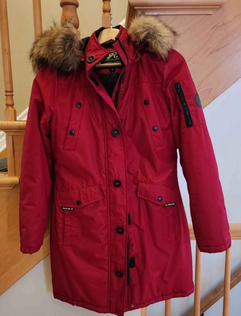 Selling a red winter parka from PC Apparel. It's a size small and has a fur-trimmed hood to keep you extra cozy during those cold winter days. worn 1 seaon.