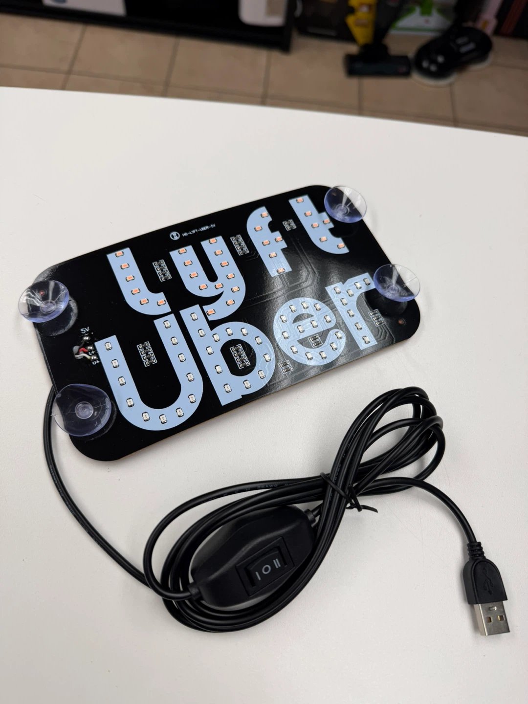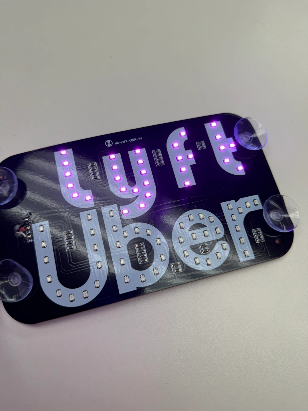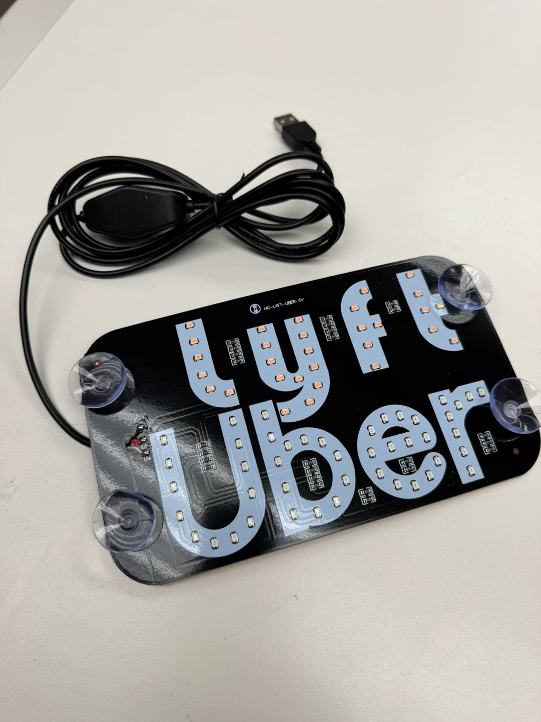 Selling an LED sign that displays both 'Lyft' and 'Uber'. It comes with suction cups for easy mounting and a USB cable for power. Perfect for ride-share drivers!