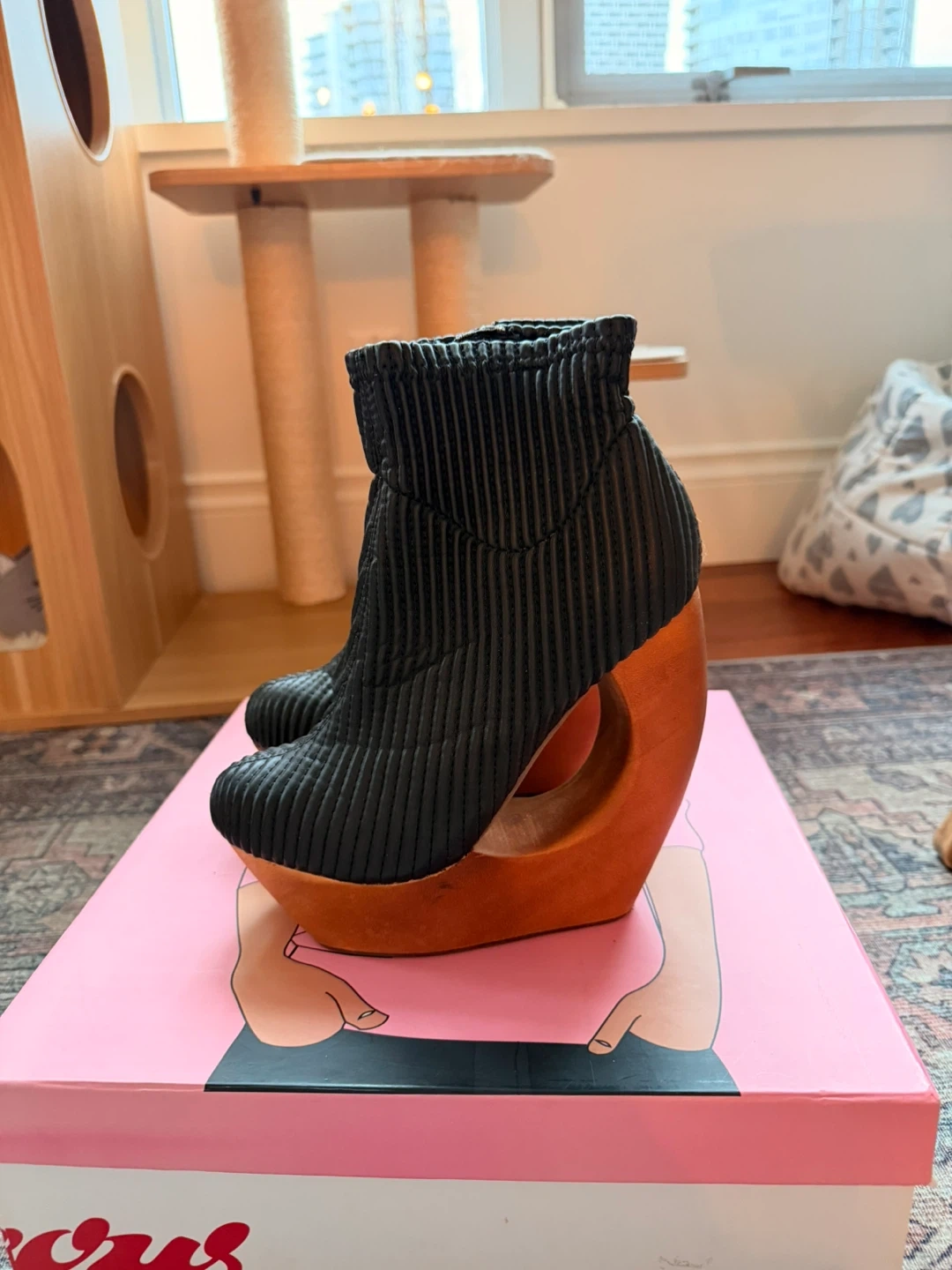 Selling a pair of Jeffrey Campbell ankle boots in black, size 6! They have a unique wooden heel and come with the original box. These are a stylish statement piece for any wardrobe