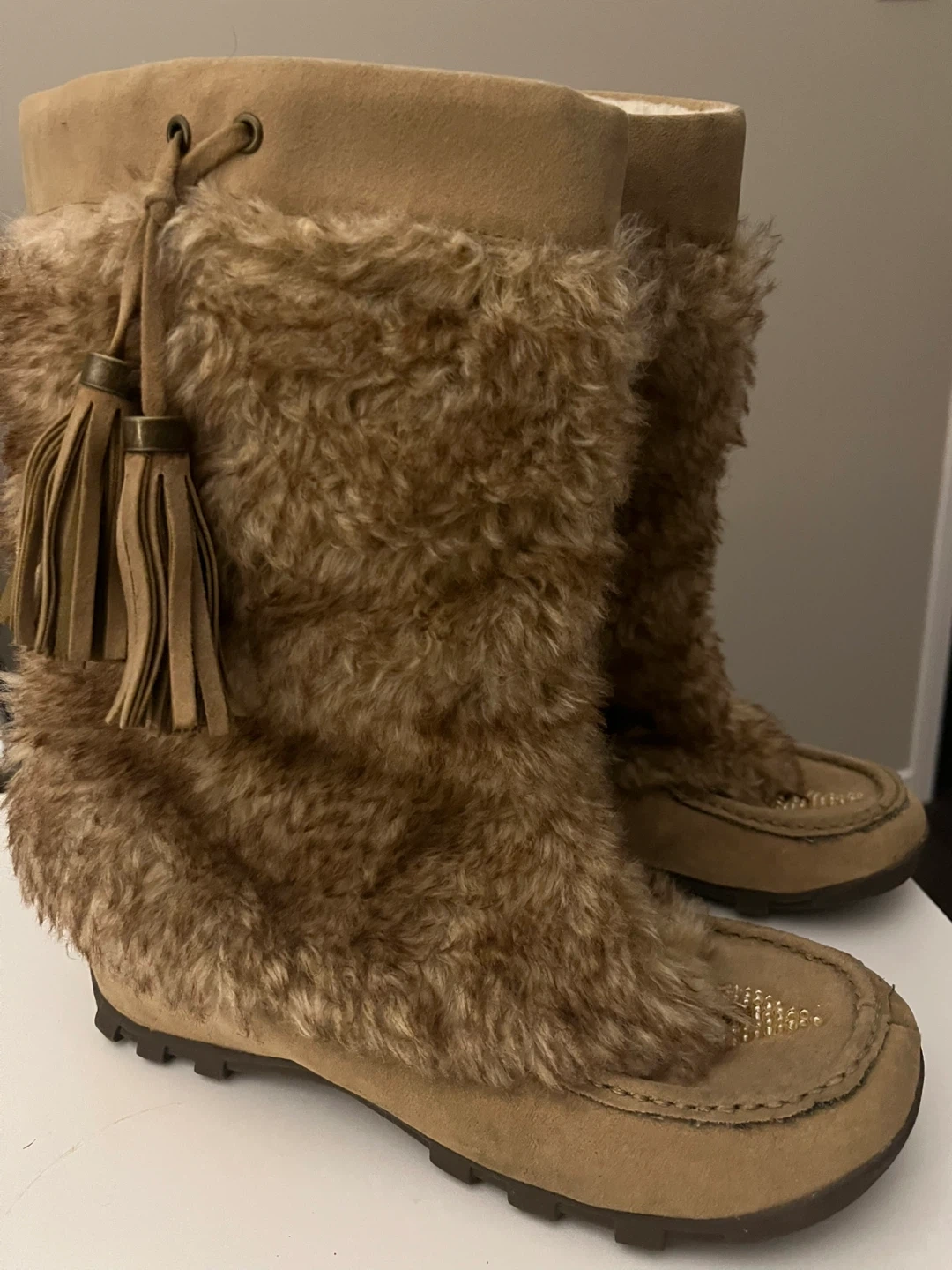 Cozy winter boots! These are a beautiful brown suede with faux fur trim. Perfect for keeping your feet warm and stylish during the cold months. Size 7.5