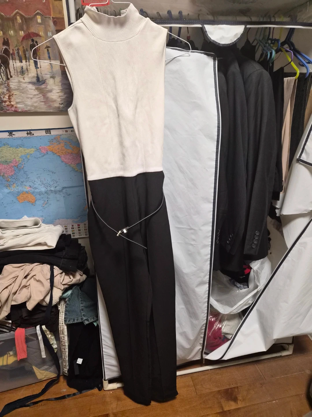 Selling a stylish two-tone sleeveless jumpsuit! The top is a cream colour and the bottom is black. It's in great condition and would be a lovely addition to any wardrobe