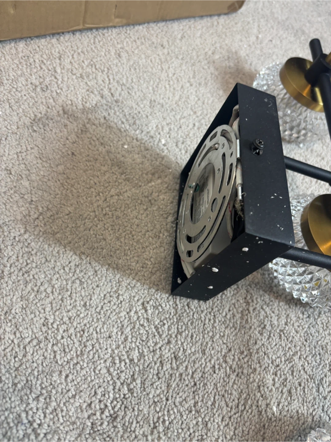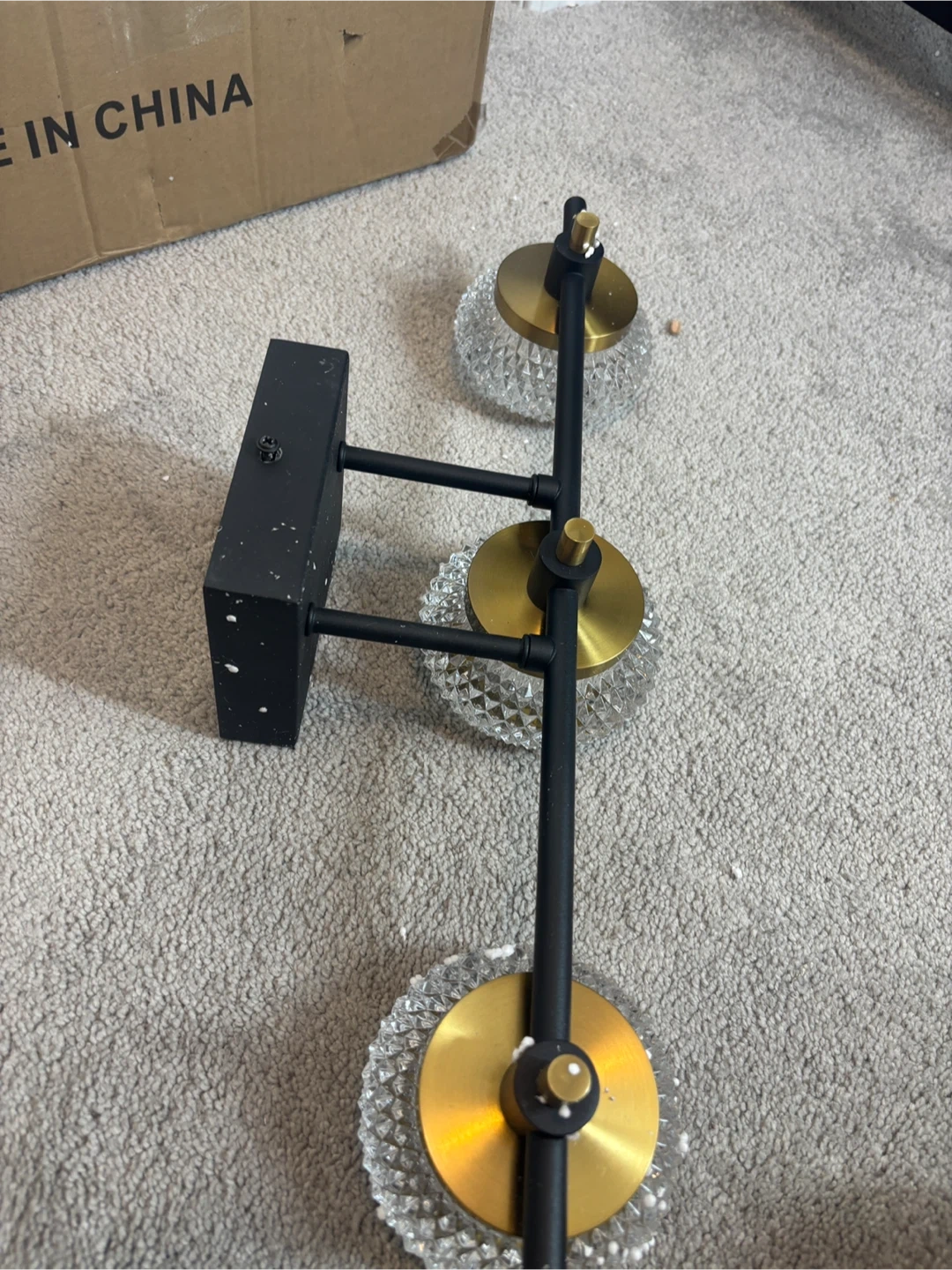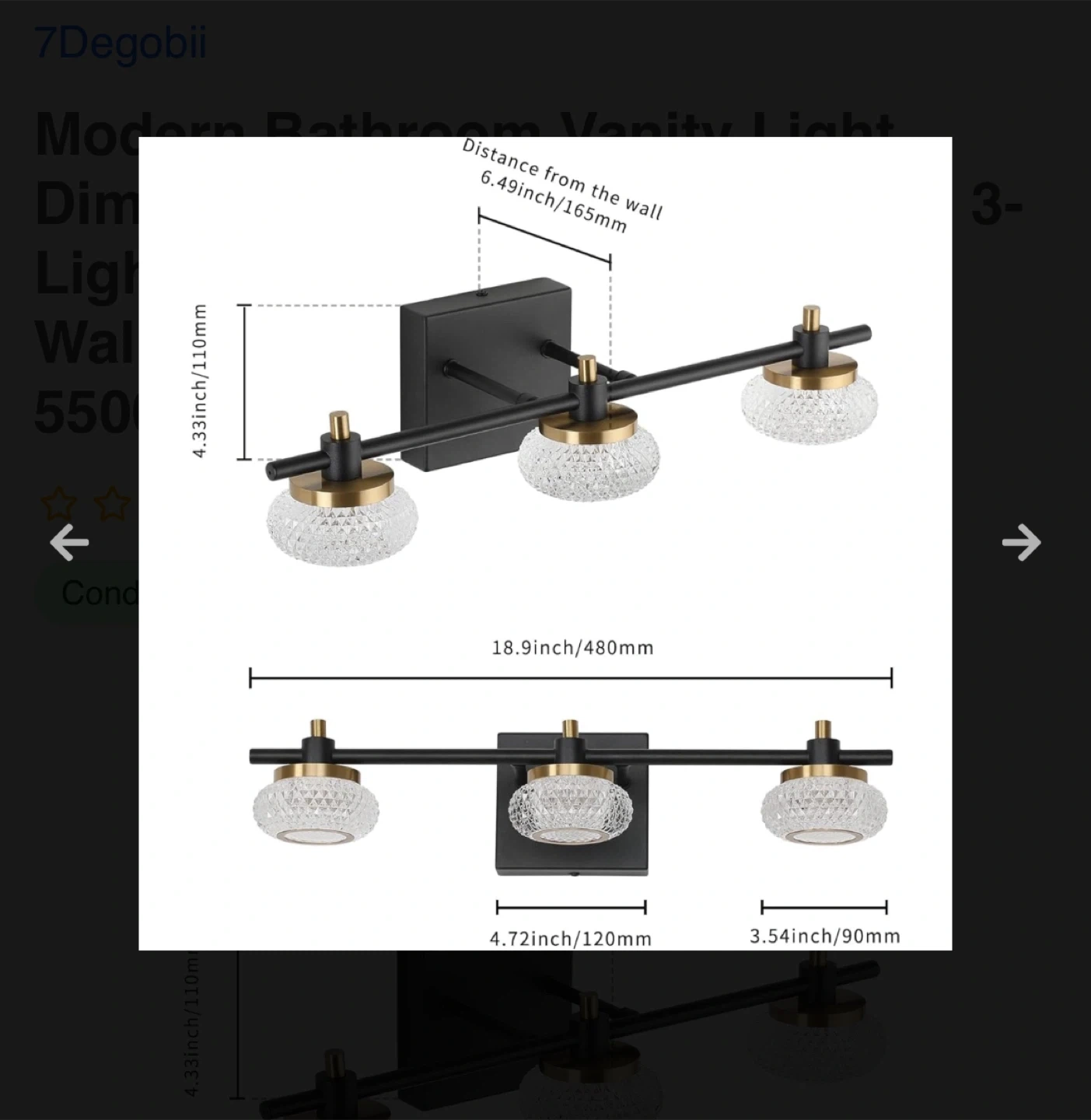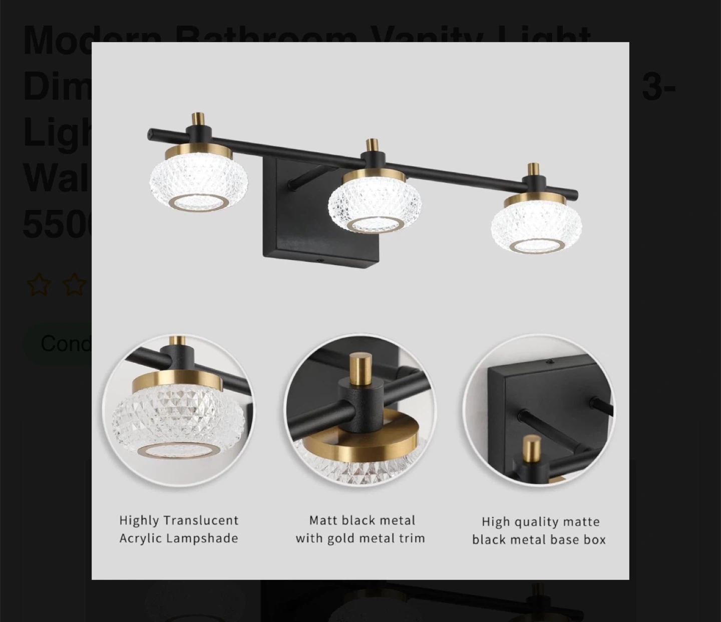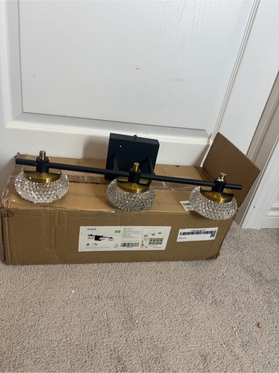 Selling a modern bathroom vanity light fixture with three lights! It has a matte black metal finish with gold metal trim and highly translucent acrylic.