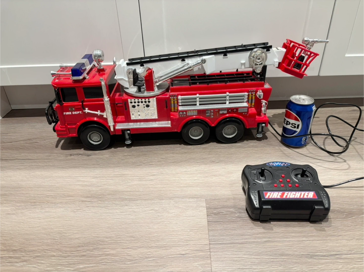 Moves forwards and reverse , plays sirens, can raise and lower ladder and spin it in back and fourth in either direction all by remote .