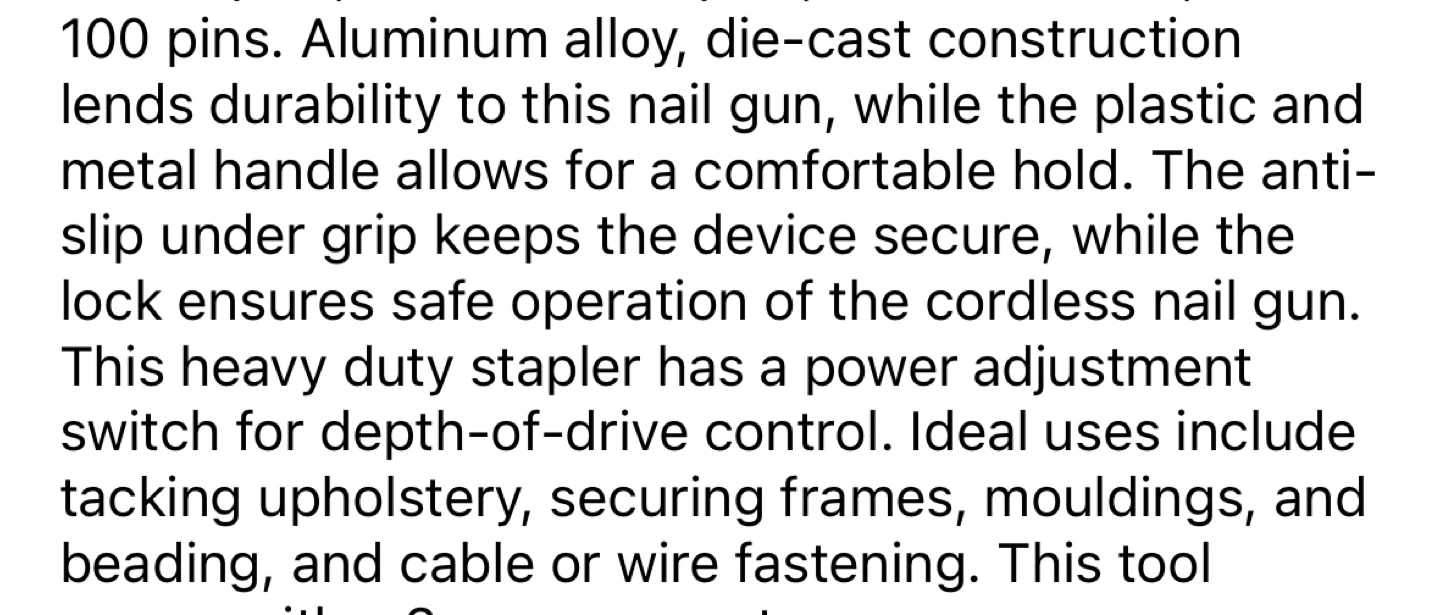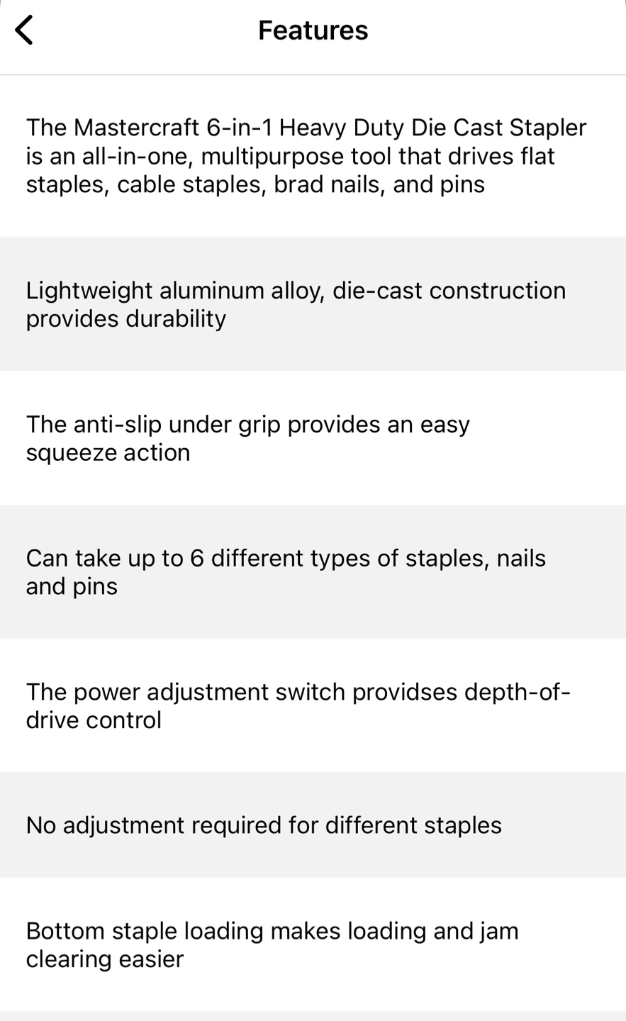 Mastercraft 6-in-1 heavy-duty stapler. It's a multipurpose tool that drives flat staples, cable staples, brad nails, and pins.