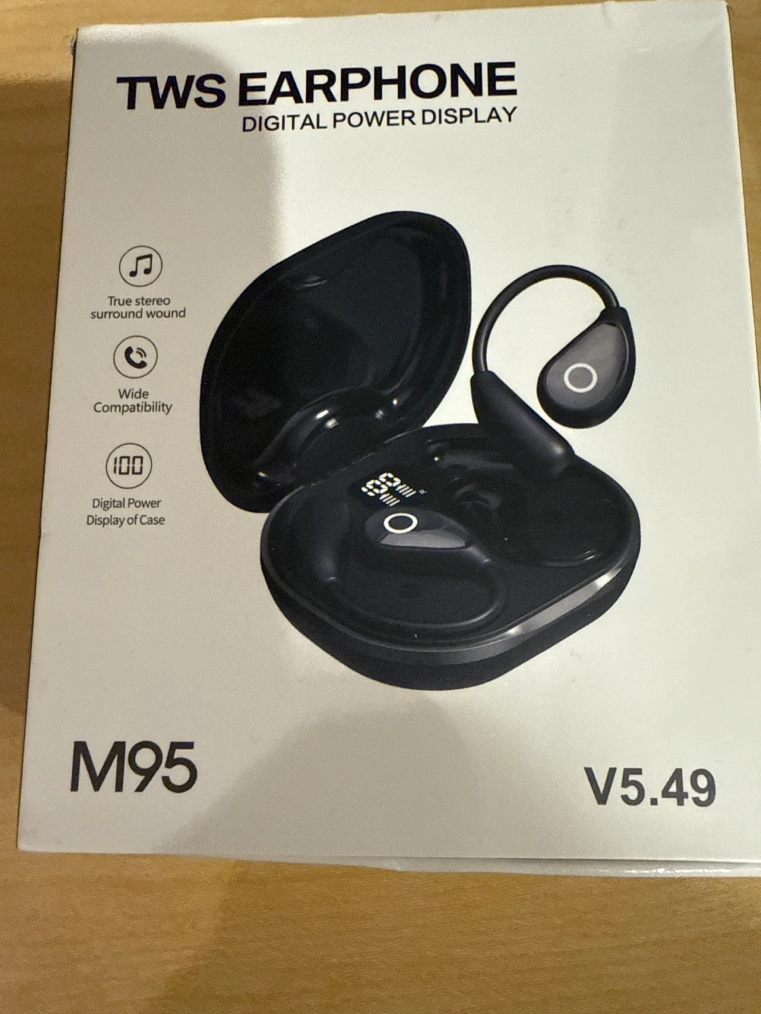 Selling a pair of TWS earphones with a digital power display, version 5.49. They look to be in great condition and come in their original box