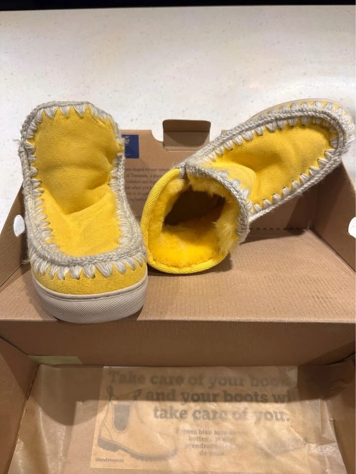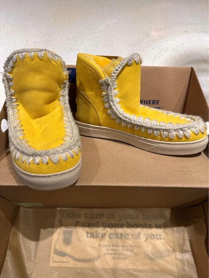 Yellow Suede Cozy and stylish Mou ankle boots in bright yellow suede with signature hand-crocheted wool stitching. Lined with soft shearling for warmth and comfort, and finished with a durable rubber sole. Excellent condition — clean and barely worn. No box. Size: 7