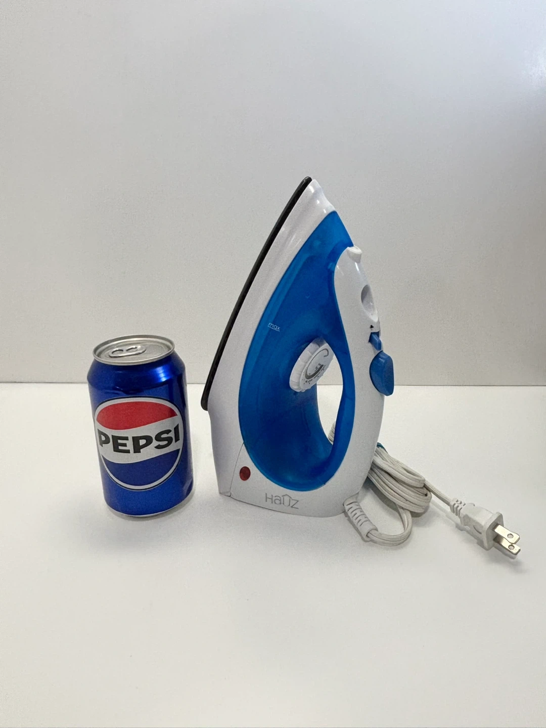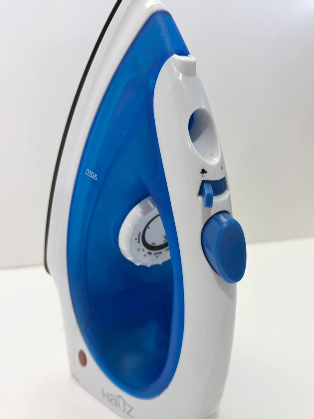 Hauz Steam & Spray Iron. The model number is AIN837. It is a blue and white iron with a non-stick soleplate.