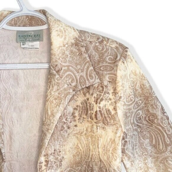 1990s Bantry Bay open-front blazer featuring a shimmering gold-beige palette and intricate baroque-style embroidered paisley. Lightweight cotton blend with folded sleeves for a modern, effortless look. Perfect for quiet luxury, vintage glam, cottagecore, or evening layering.