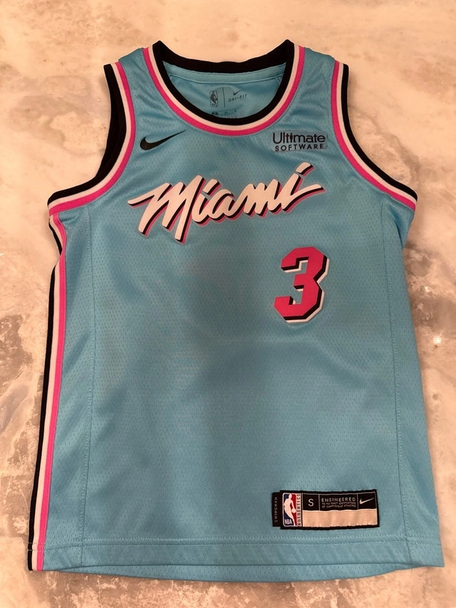 This is a Nike Miami Heat Dwyane Wade #3 jersey in a kids size small. It's in excellent condition and perfect for any young Wade fan. It's a great piece of memorabilia for any basketball enthusiast!