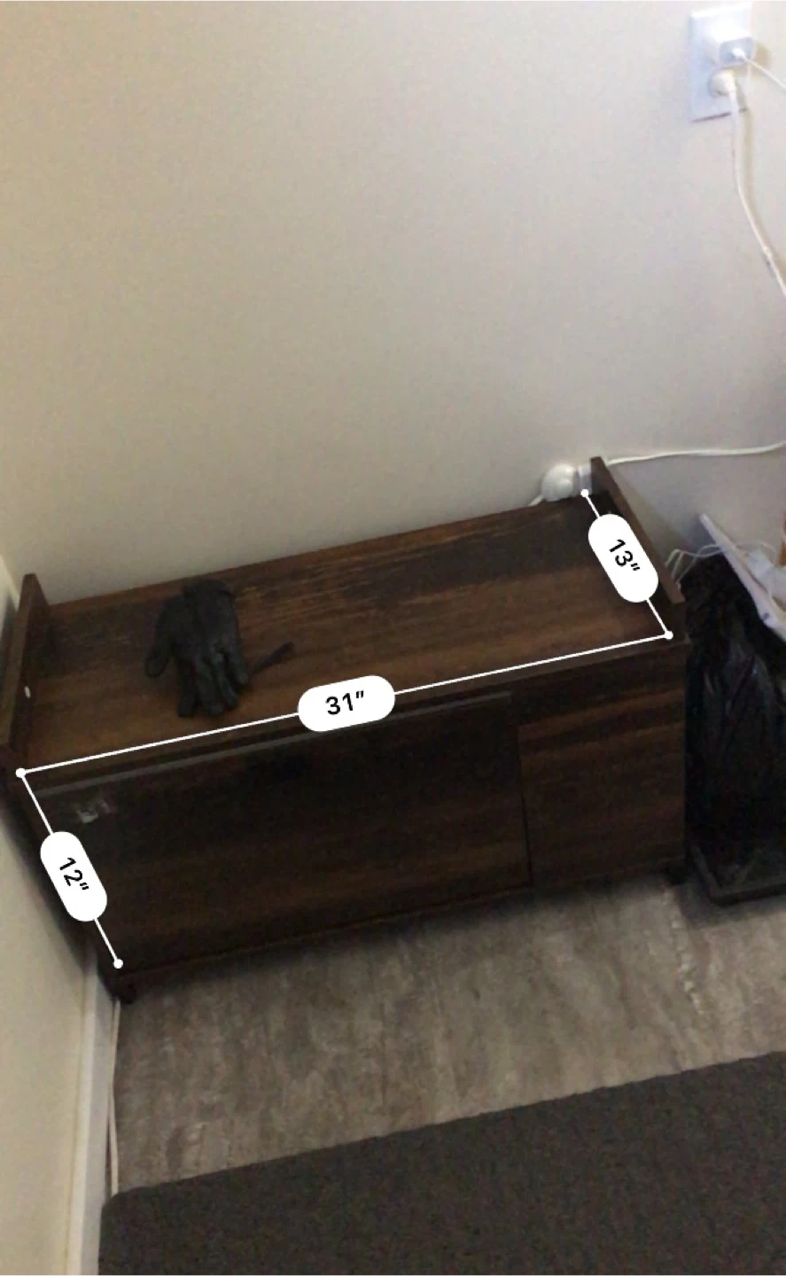 Selling a wood shoe storage bench! It's a dark wood colour and the dimensions are approximately 31 inches wide, 12 inches deep, and 13 inches tall. It has a cabinet door on one side and open shelves on the other, perfect for keeping your entryway tidy