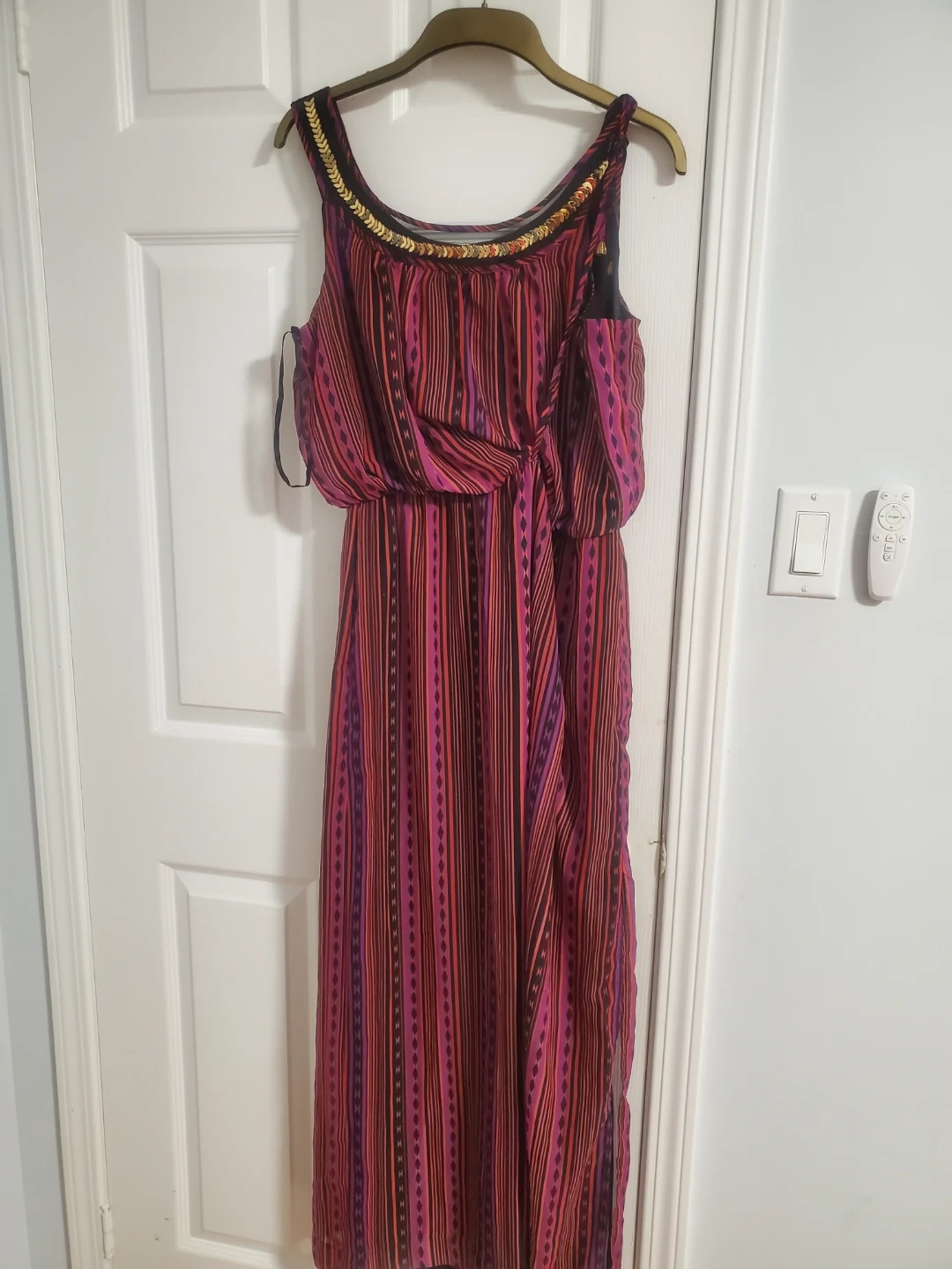 A beautiful striped maxi dress with gold sequin detailing around the neckline. It's perfect for summer or a special occasion!