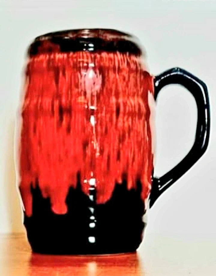 Vintage Evangeline Tankard from the 1970s, featuring a striking red and black glaze and a substantial build