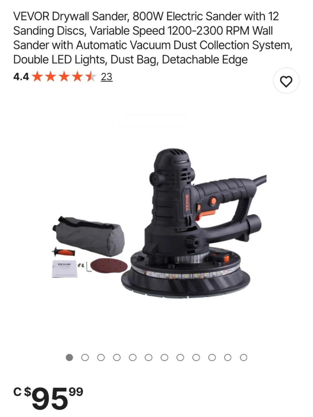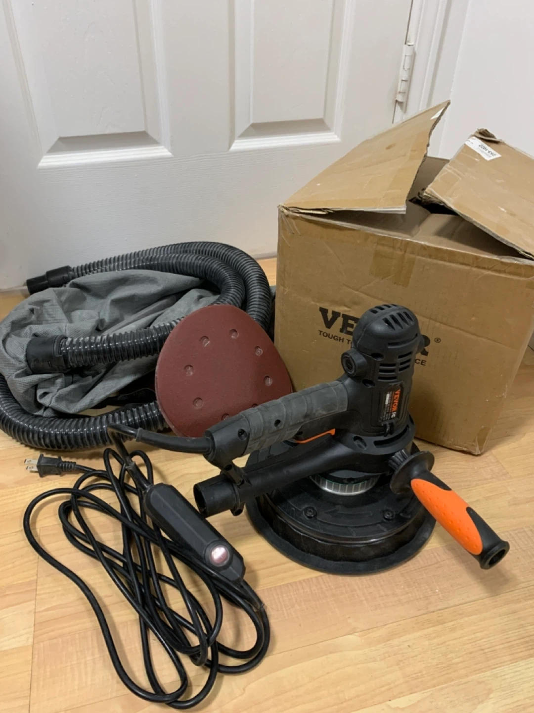 Selling a VEVOR Drywall Sander! This is an 800W electric sander with variable speed from 1200-2300 RPM. It comes with sanding discs, an automatic vacuum dust collection system, double LED lights, a dust bag, and a detachable edge. Originally bought for $100+HST!
