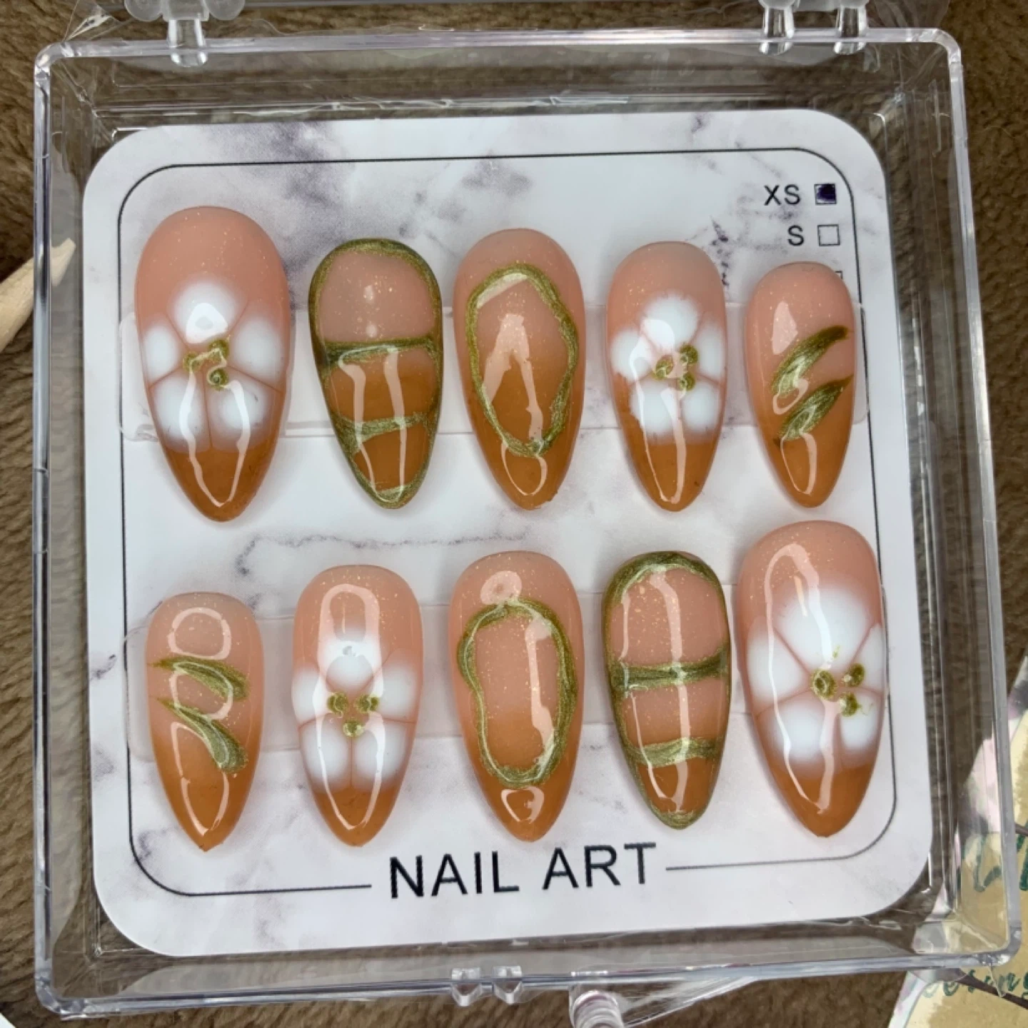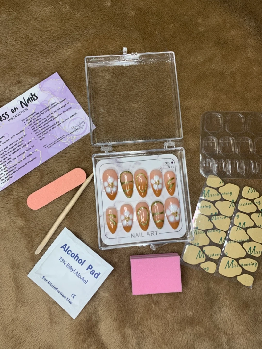 Brand new set of press on nails with a beautiful nail art design! The set includes everything you need for application, including an alcohol pad and nail file. Sizes XS available. Perfect for a quick and easy manicure at home
