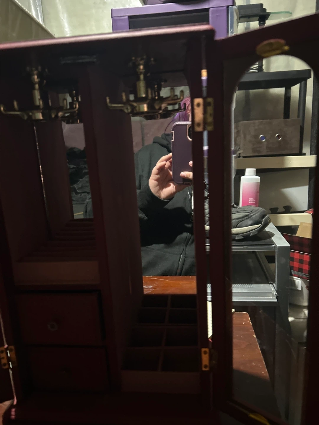 Selling a red wooden jewellery cabinet. It has a drawer and lots of compartments for all your jewellery needs! There are hooks at the top for necklaces and bracelets. The inside is lined with a soft pink velvet-like material to keep your items safe and scratch-free