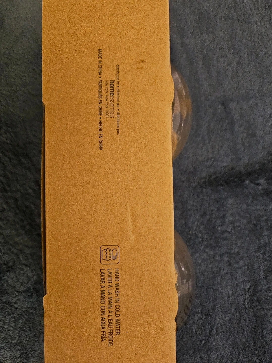 Selling a set of two Rae Dunn stemless wine glasses. They each hold 19 fl oz and feature unique designs. One says 'Believe' with a bee, and the other says 'Happiness' with a flower. These glasses are hand wash in cold water only and come in the original box