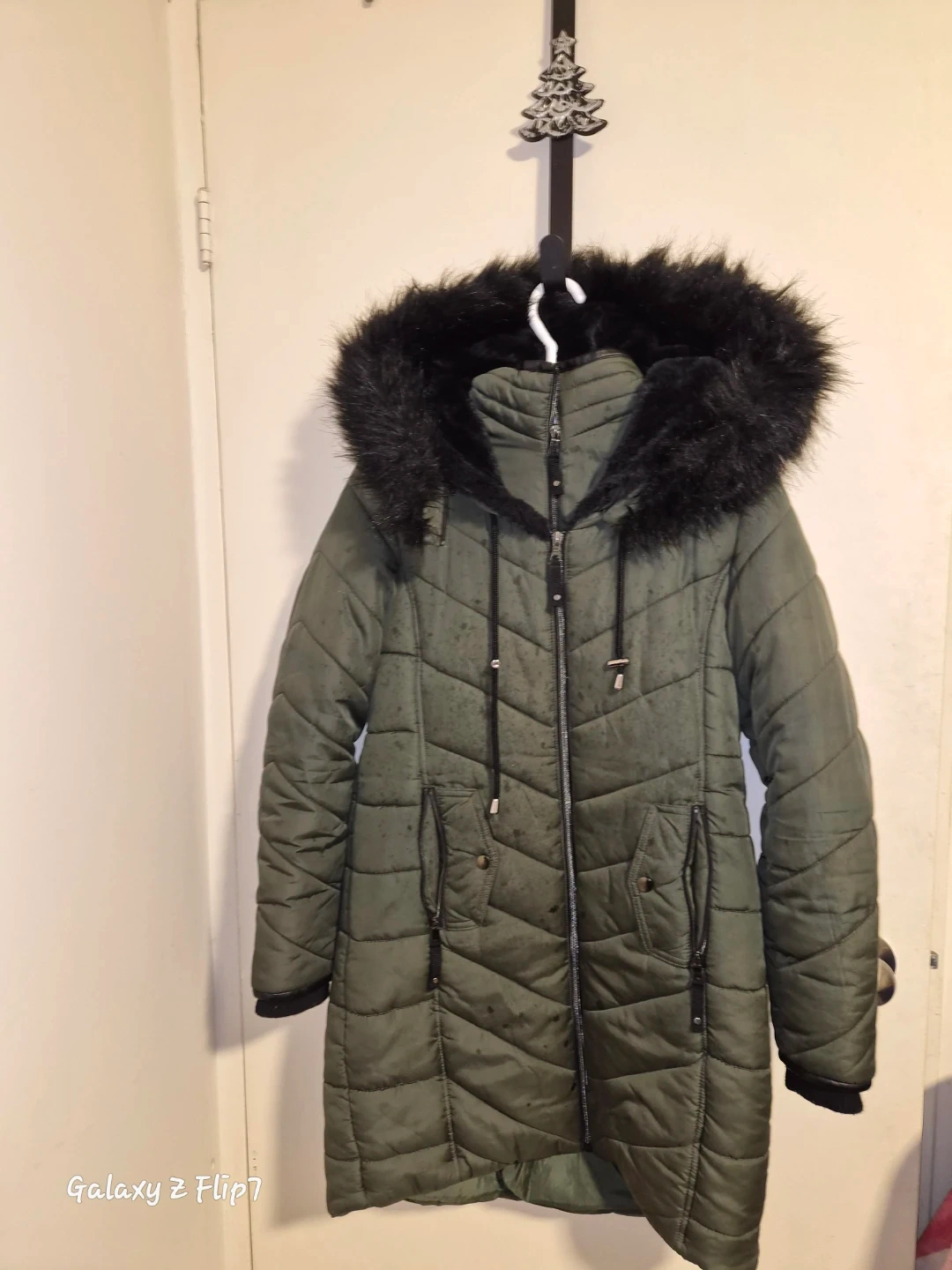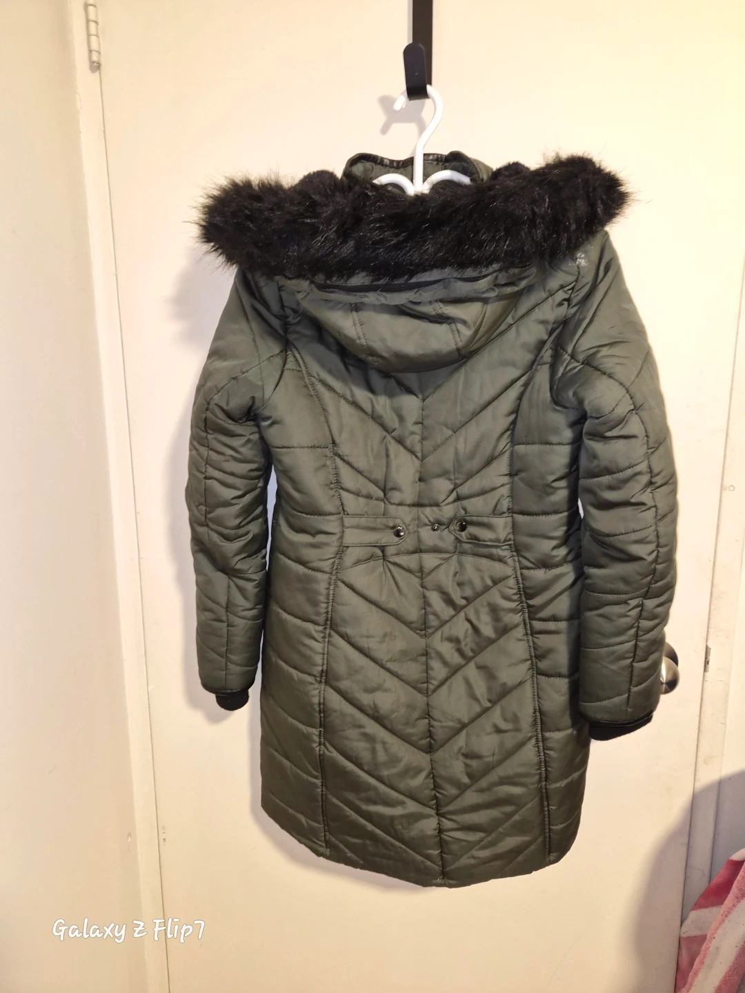 I'm selling a cozy olive green puffer coat, perfect for the colder weather. It features a stylish faux fur hood to keep you extra warm. It's in great condition and ready for a new owner!